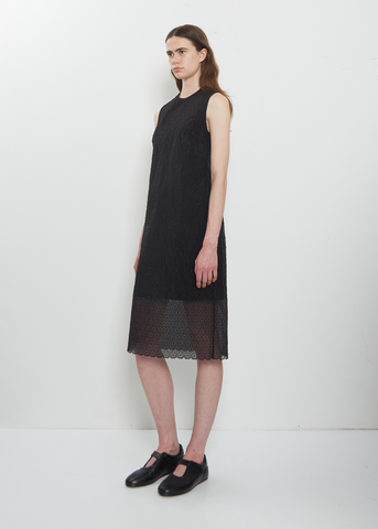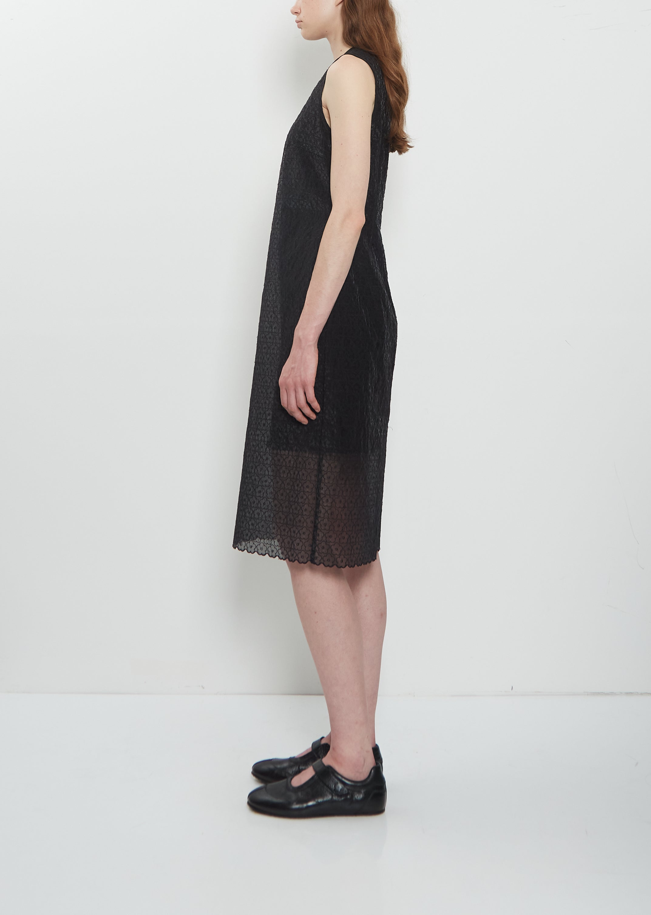 Cecilie Bahnsen black sleeveless dress with a round neckline in a semi-sheer floral embroidered cotton blend fabric. Features a slit at back hem and a hook and eye, and zipper closure at center back. Comes partially lined in tonal silk.