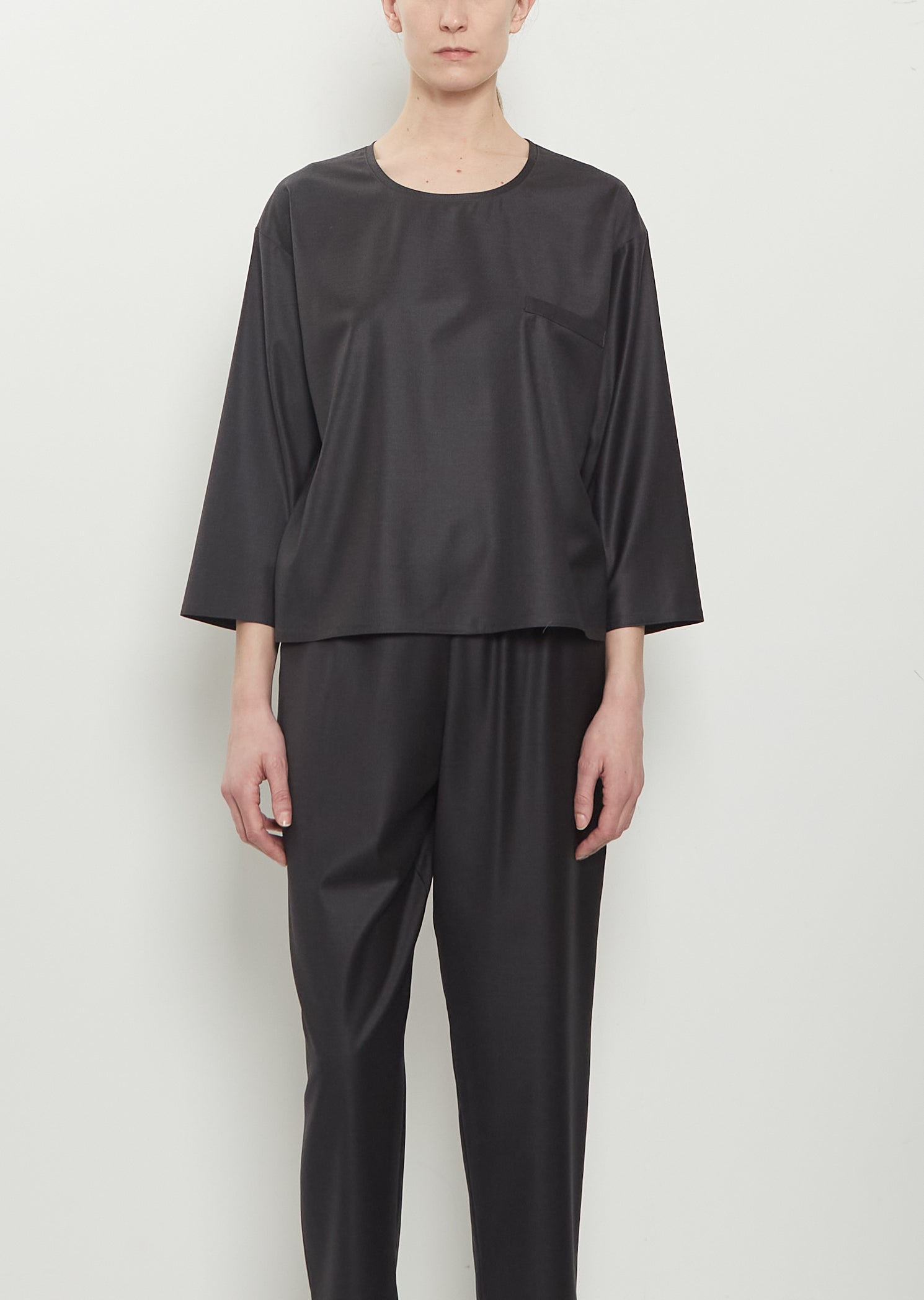 Dušan dark grey long sleeve top with a round neckline in smooth and airy wool. Features a single welt pocket at chest and a straight hem. Relaxed fit.