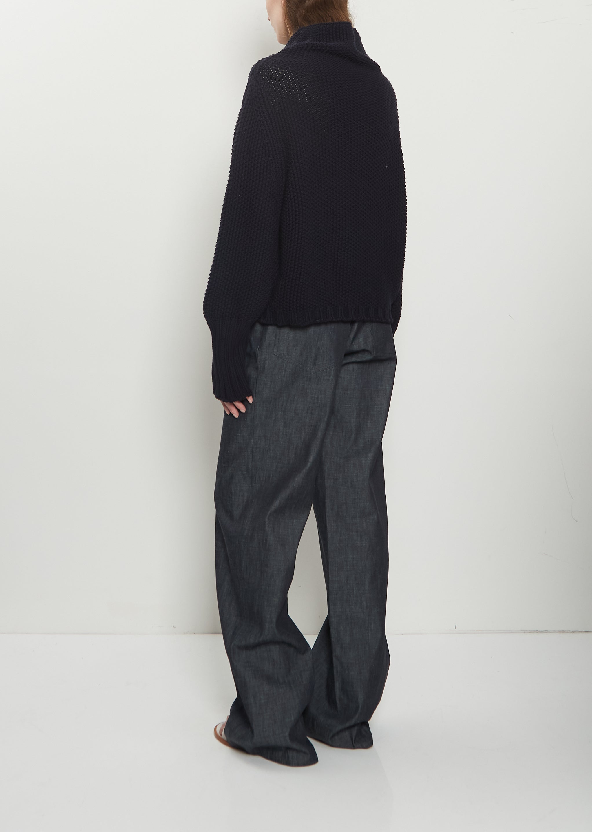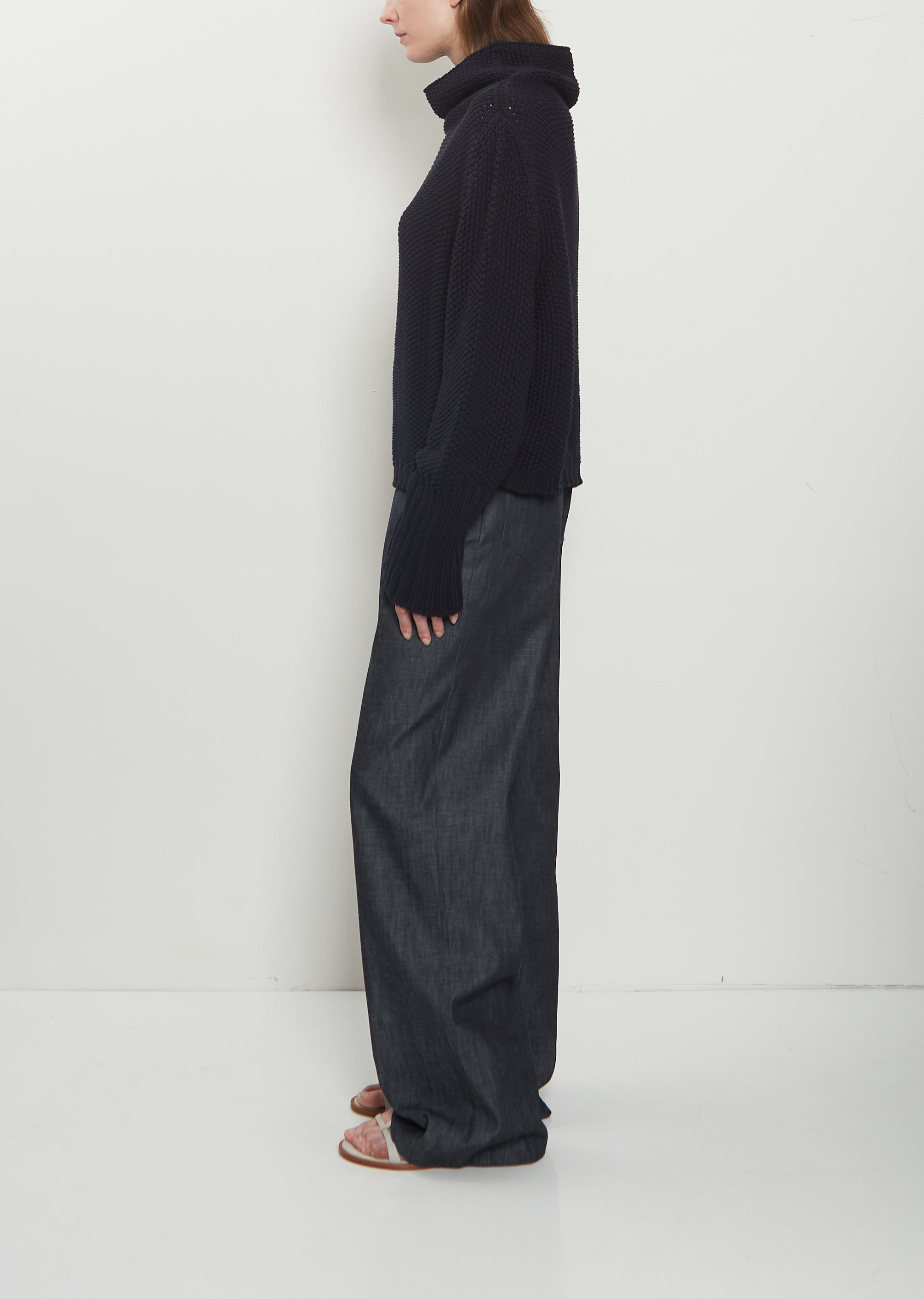 Dušan midnight navy sweater with signature cowl high neck and dropped shoulders in mid-weight textured cotton knit. Features kimono sleeves and ribbed trim finishings at neckline, elongated cuffs, and hem. Relaxed, loose fit.