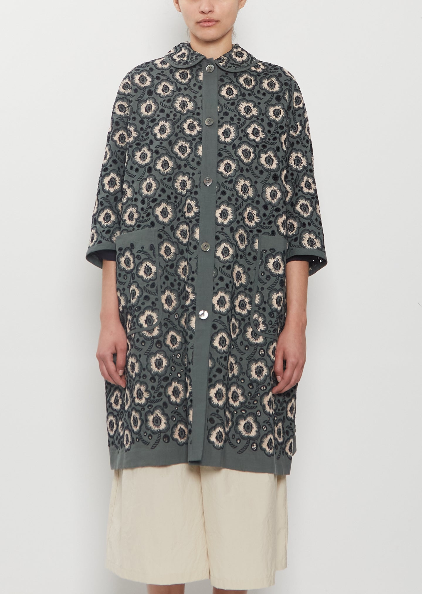 Minä Perhonen moss green single breasted oversized coat in high density linen with a unique floral embroidery and open-work details. Features a rounded collar, elbow length sleeves, deep patch pockets at front, and tonal nacre-hued buttons closure at front. Comes unlined.