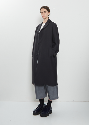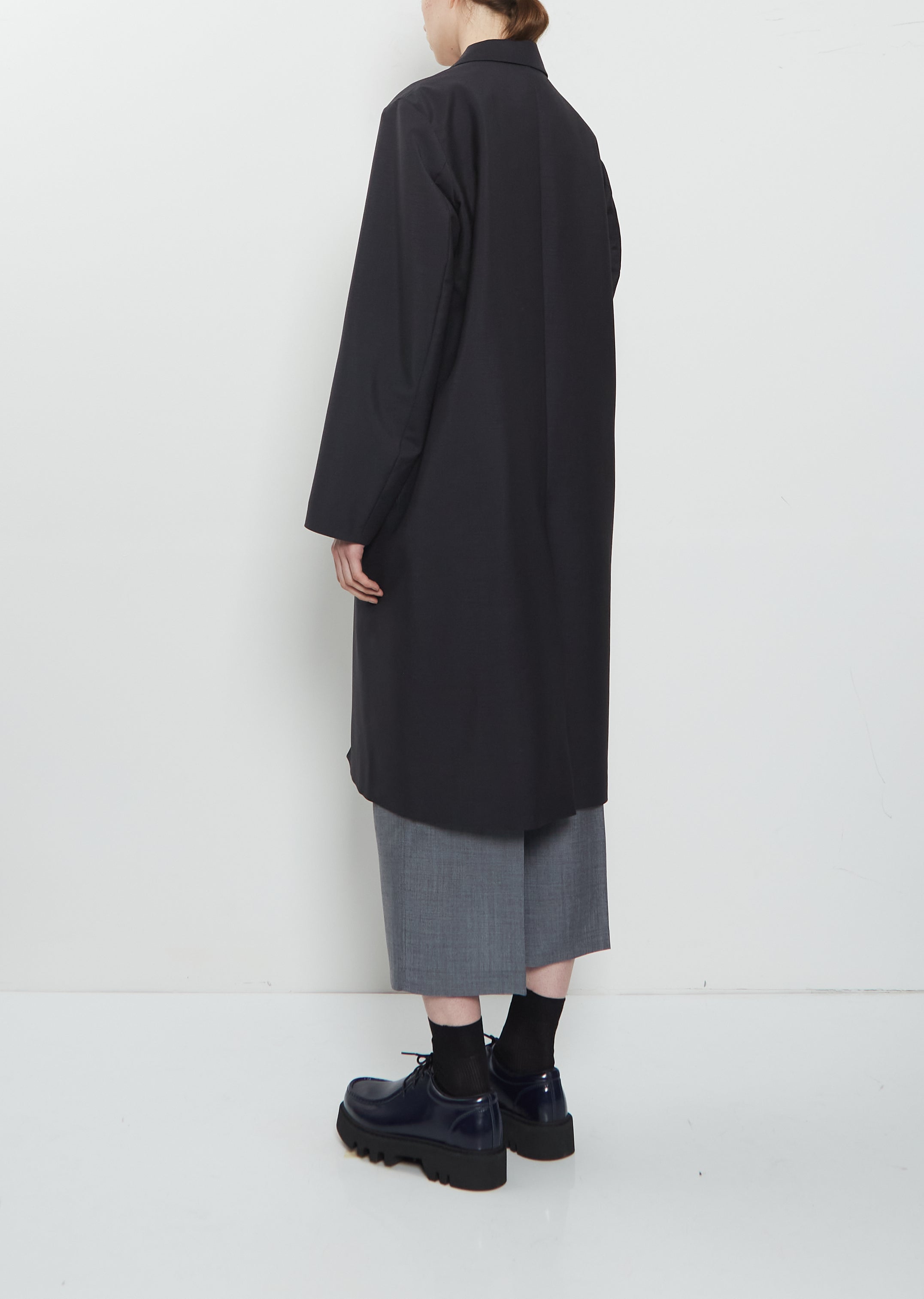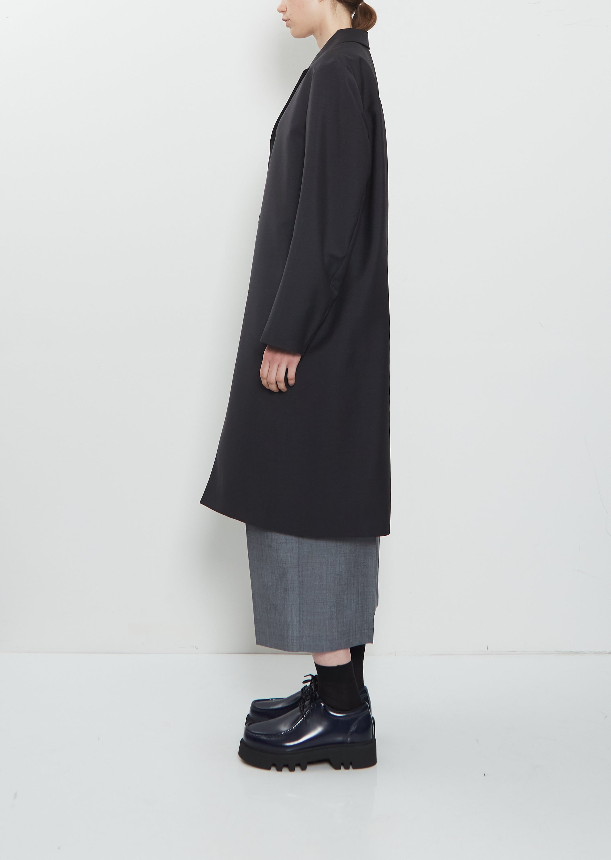 Sofie D'Hoore black coat with a notched collar and side welt pockets in a lightweight tropical mohair wool. Features paneled sleeves, a center seam detail at back, and a nacre-hued 3-button closure. Comes unlined.