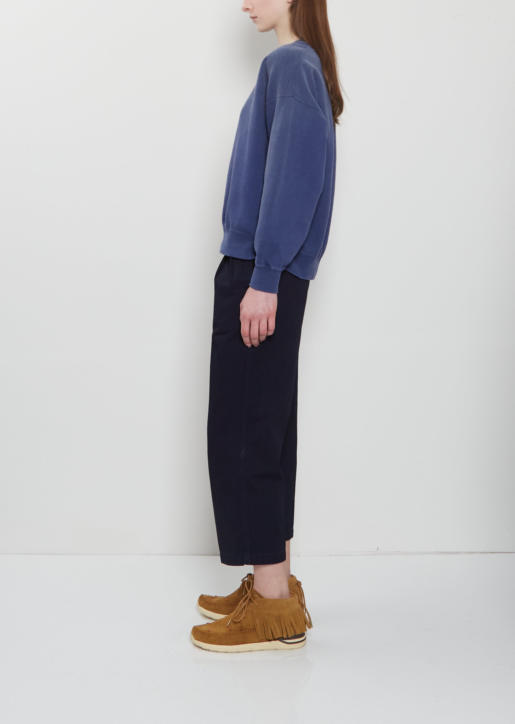 Visvim blue sweatshirt with a round neck and dropped shoulders in a soft garment-dyed cotton French terry sweatshirt with a washed, worn-in effect. Features ribbed trim finishings at cuffs and hem. Relaxed fit.