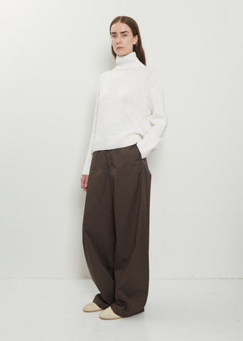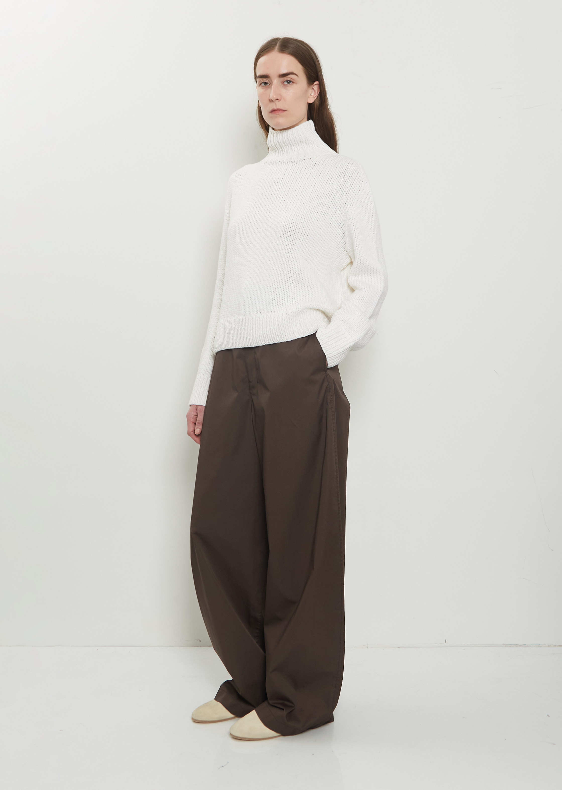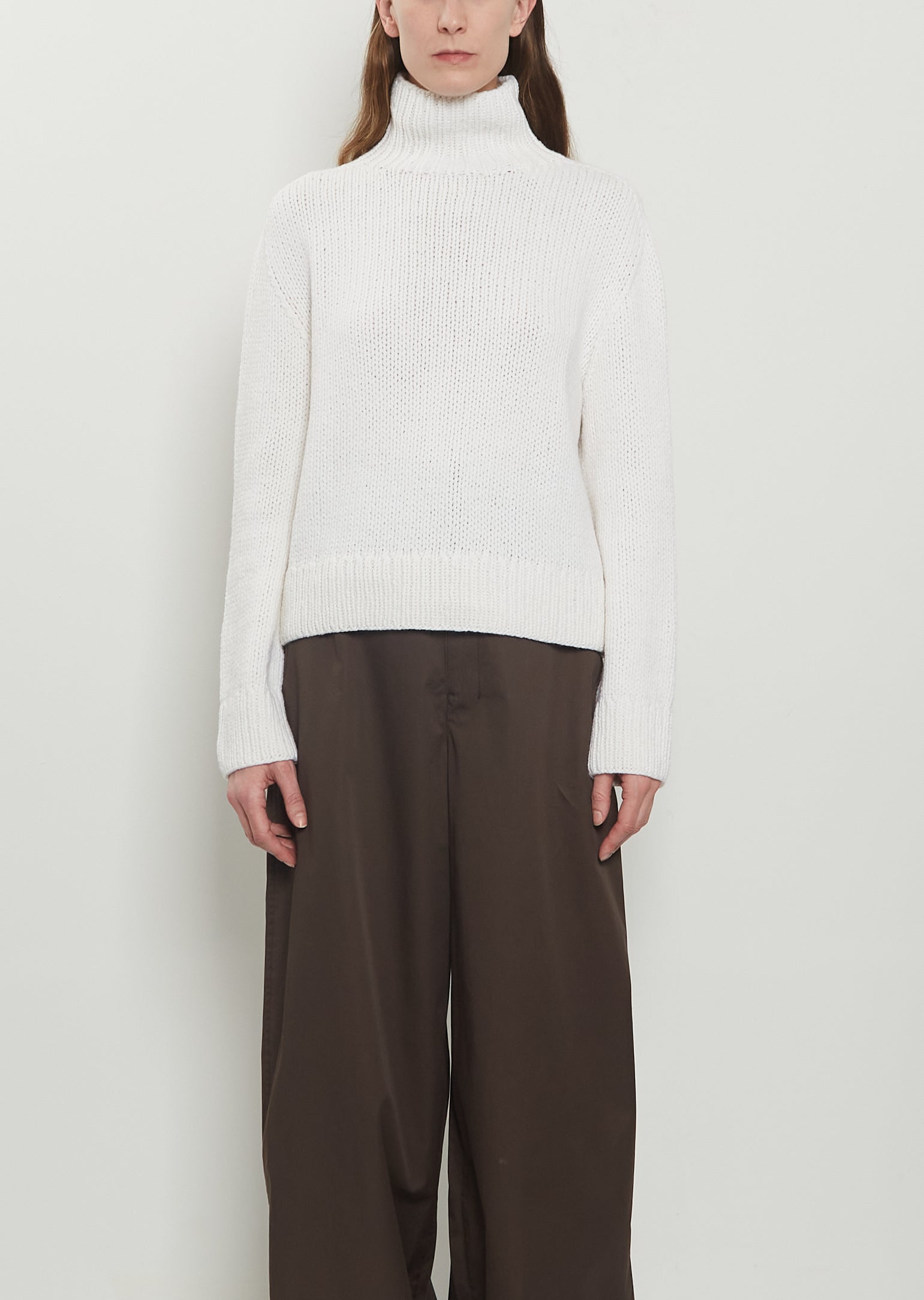 Wommelsdorff salt white signature sweater with a high ribbed neck hand-knitted in Berlin from the finest cashmere yarns. Features dropped shoulders, and wide ribbed trim finish at neck, cuffs, and hem.