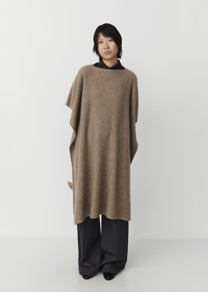 FW'20 Collection — Babaco Shaggy Cashmere Cape in Natural. Knitted in a soft, textured cashmere, cozy popover cape with a boat neckline and open sides. Also available in Blue.