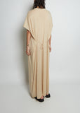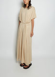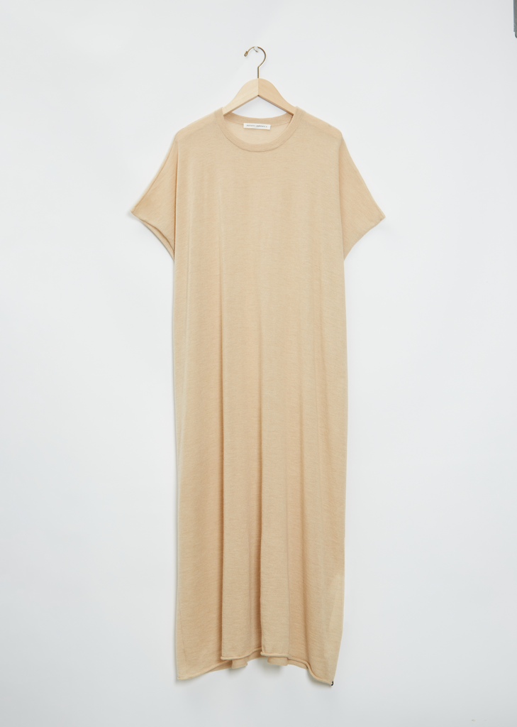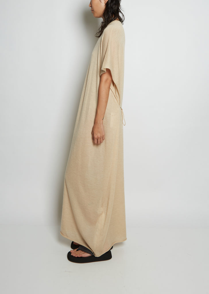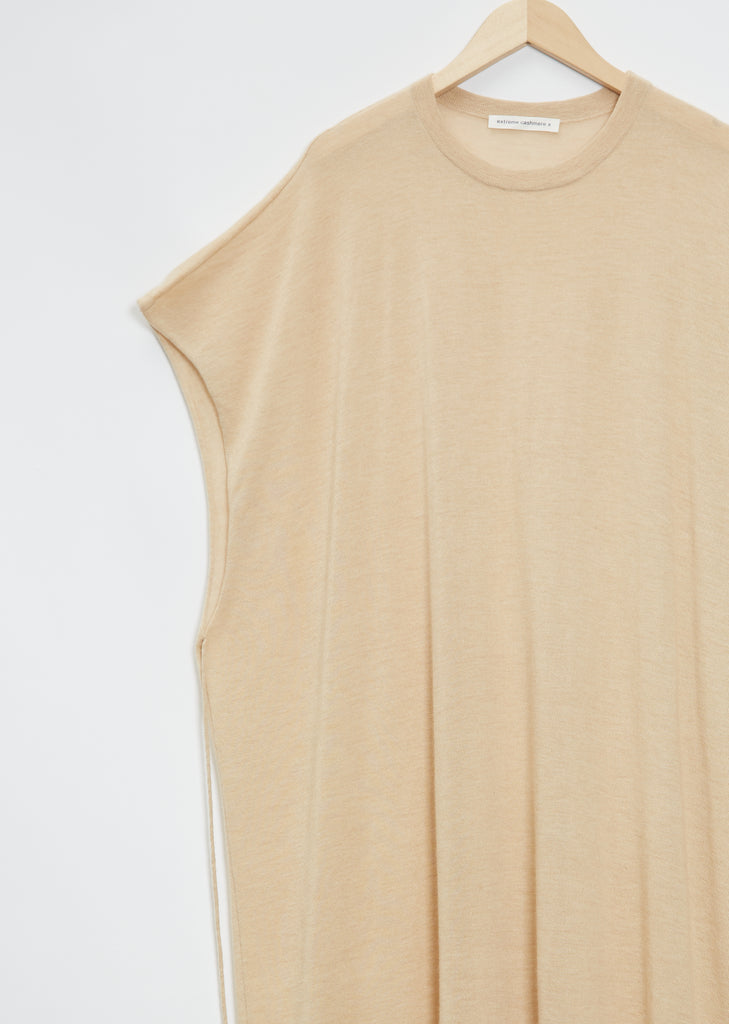 Extreme Cashmere beige round-neck caftan dress with self ties at waist and wide armholes in a fine gauge summer weight cashmere.