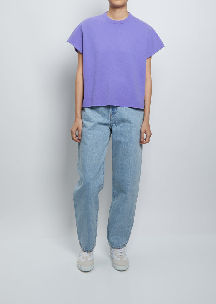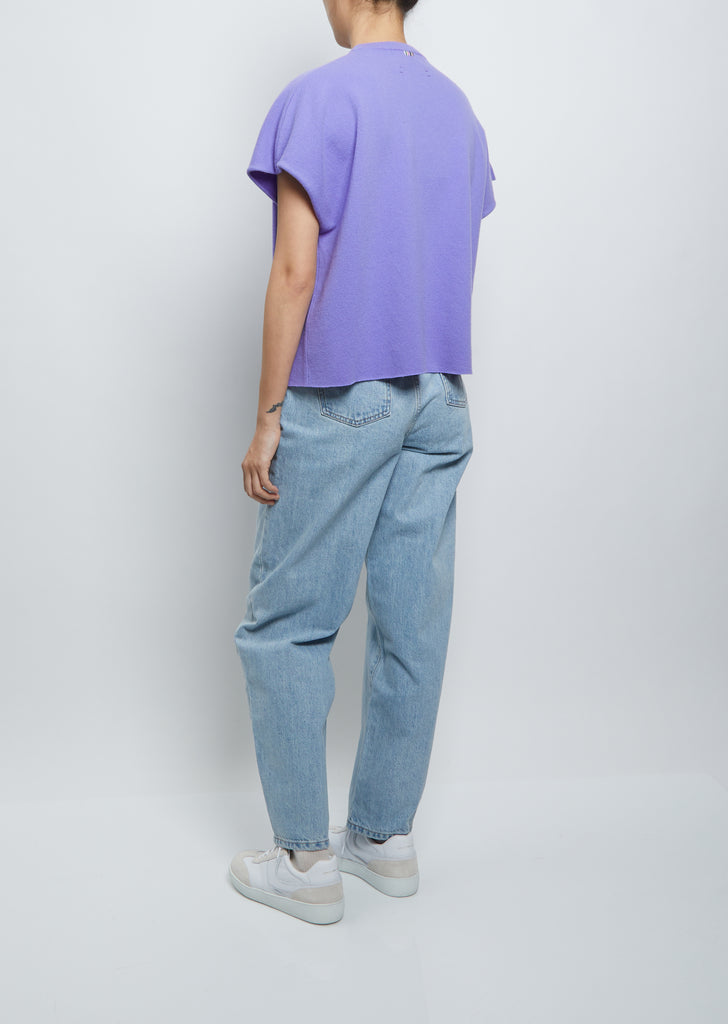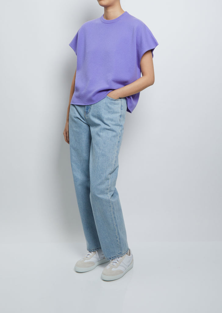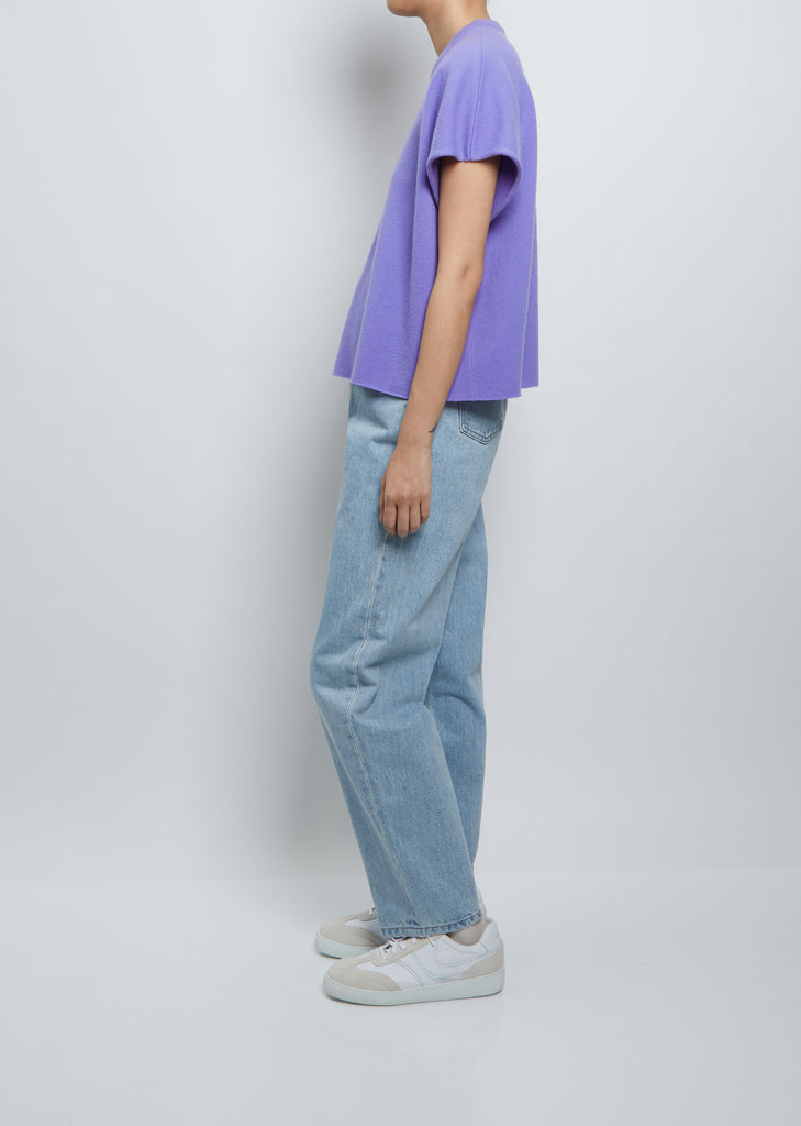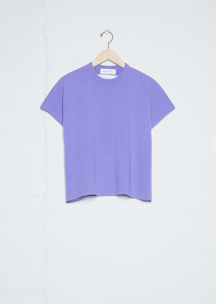 Extreme Cashmere geranium purple crewneck sweater with seamless short sleeves in a stretch cashmere blend knit. Also available in Fluo Green.
