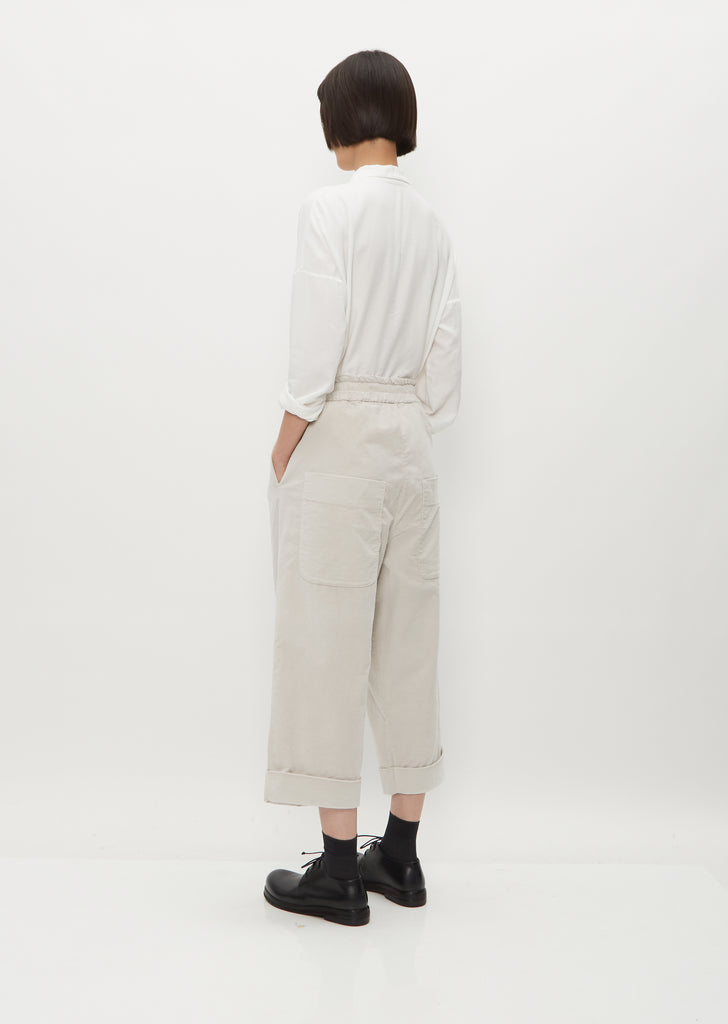 Brand Signature Piece — Album di Famiglia pale pink-grey cropped, wide leg trousers with two pleats in cotton velvet. Features a wide rolled cuff, angled side pockets, large back patch pockets, and a concealed zip fly closure. This trousers come lined in self.