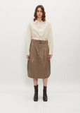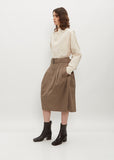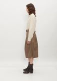 Lemaire squirrel brown skirt with small front pleats in lightweight cotton twill. Features a self belt with d-ring buckle, belt loops, welt side pockets, and a concealed zip with tab fastener. This skirt comes unlined.