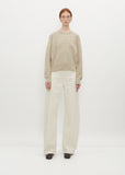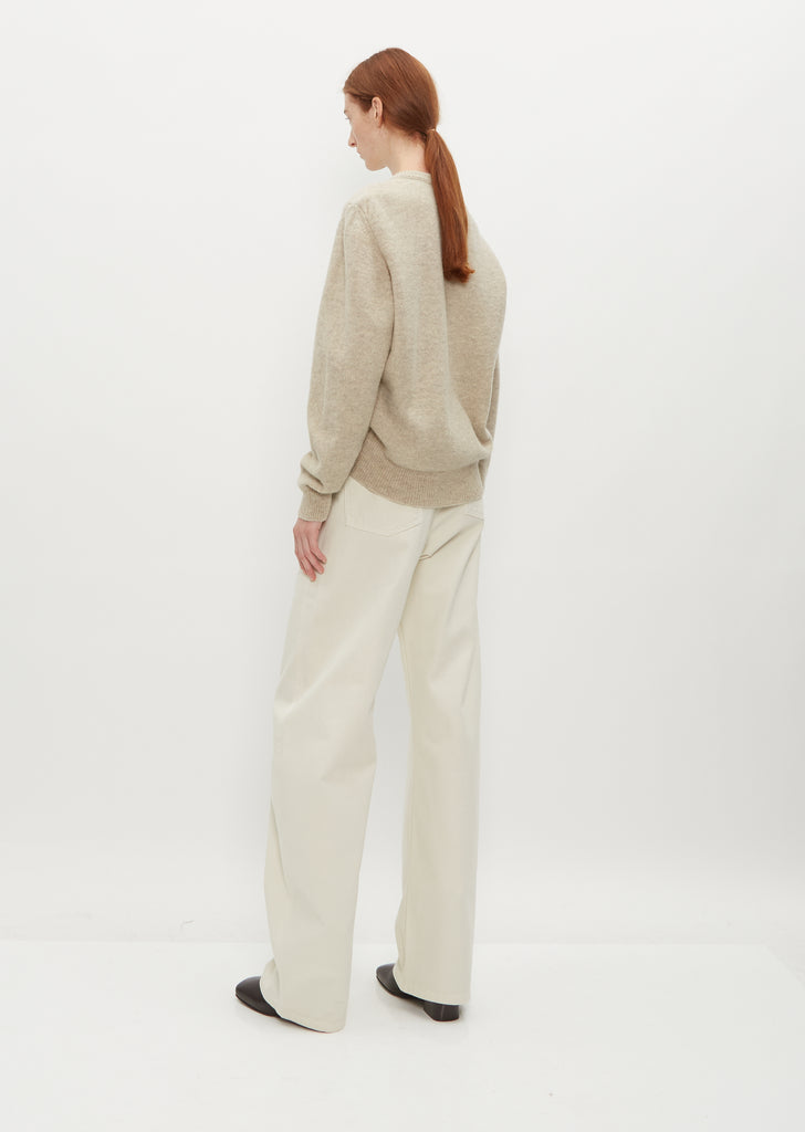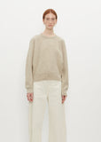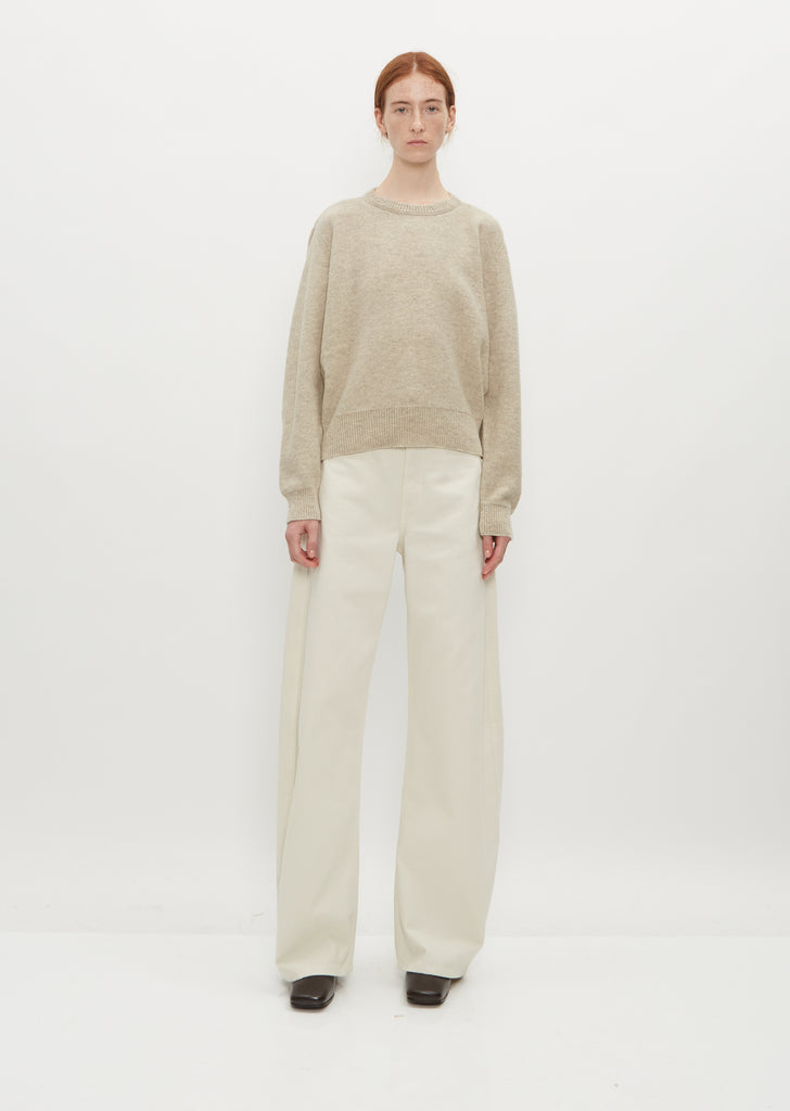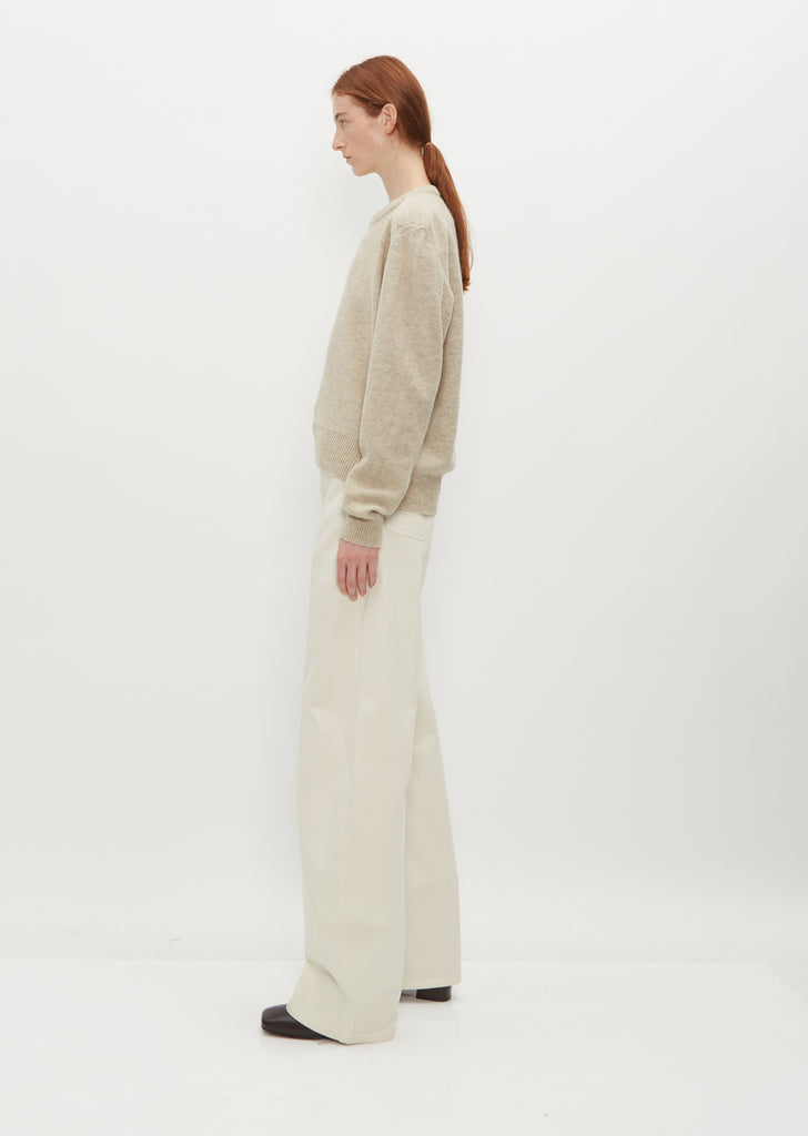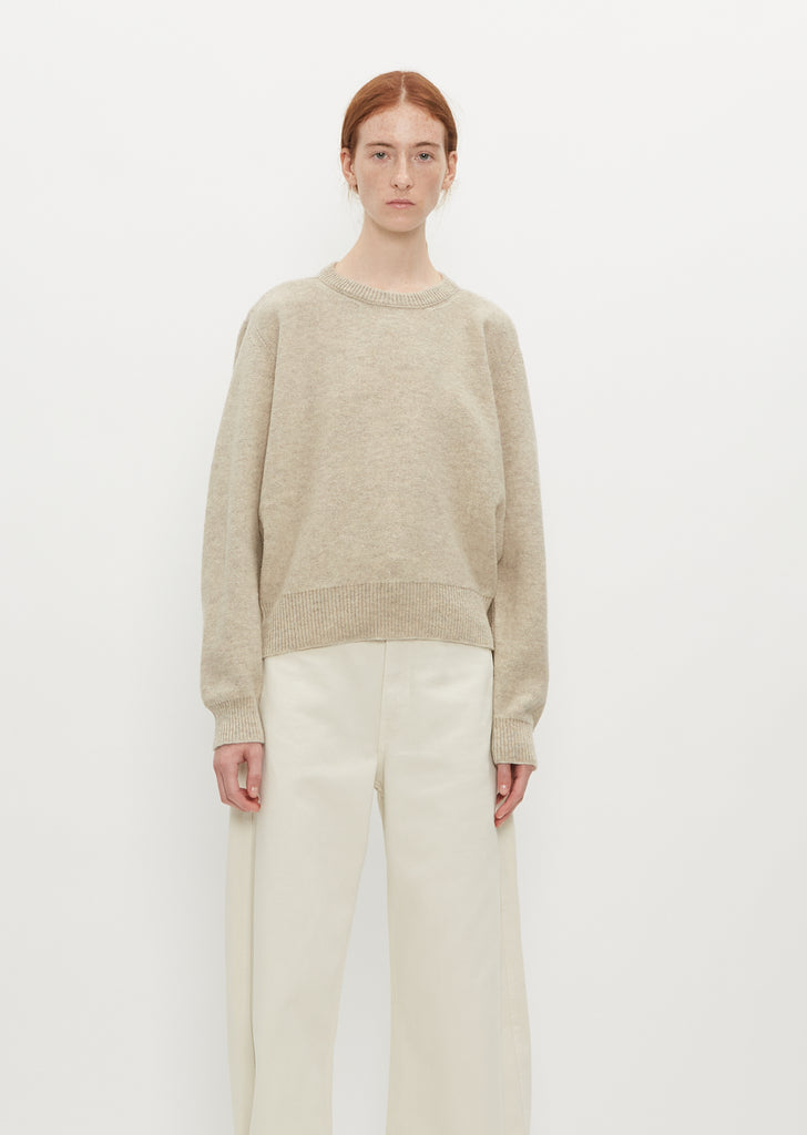 Lemaire chalk-white melange crewneck sweater with a 'tilted' shorter front and longer back panel knitted in pure shetland wool. Subtle brand signature blouson-shape silhouette. Finished with a rib trim at neckline, sleeve cuffs and hem.