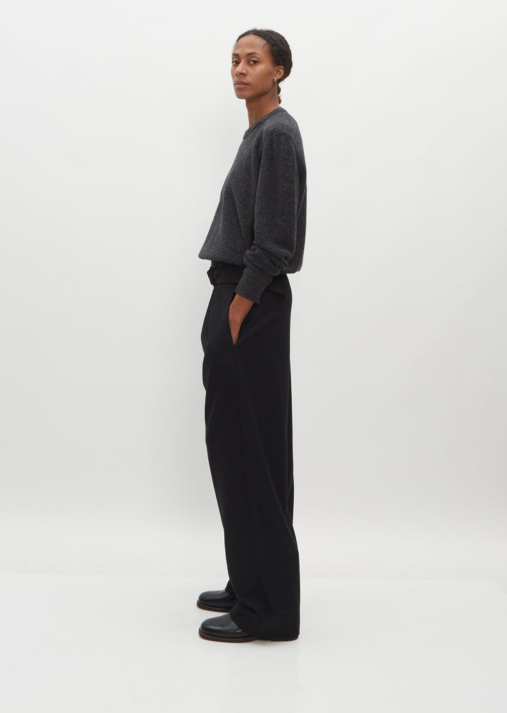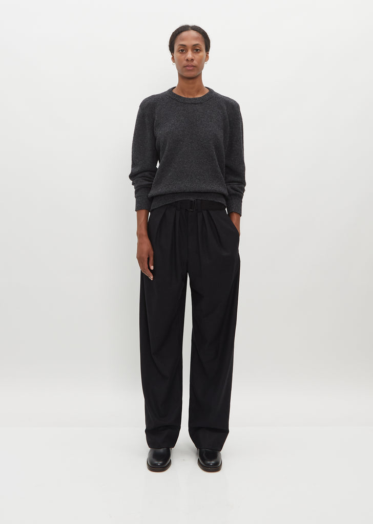Lemaire anthracite cropped, straight leg pants with front pleats and self belt in cotton linen blend. Features a detachable belt with d-ring fastening, belt loops, and concealed side pockets. Zip with tab fastener closure.
