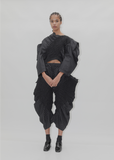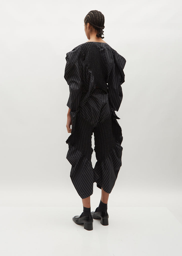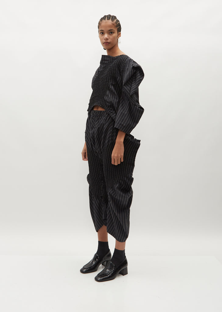 Issey Miyake black hued pinstripe cropped blouse with organic contraction form by product dyeing in light weight Japanese polyester and cotton blend. Curved silhouette with a regular fit.
