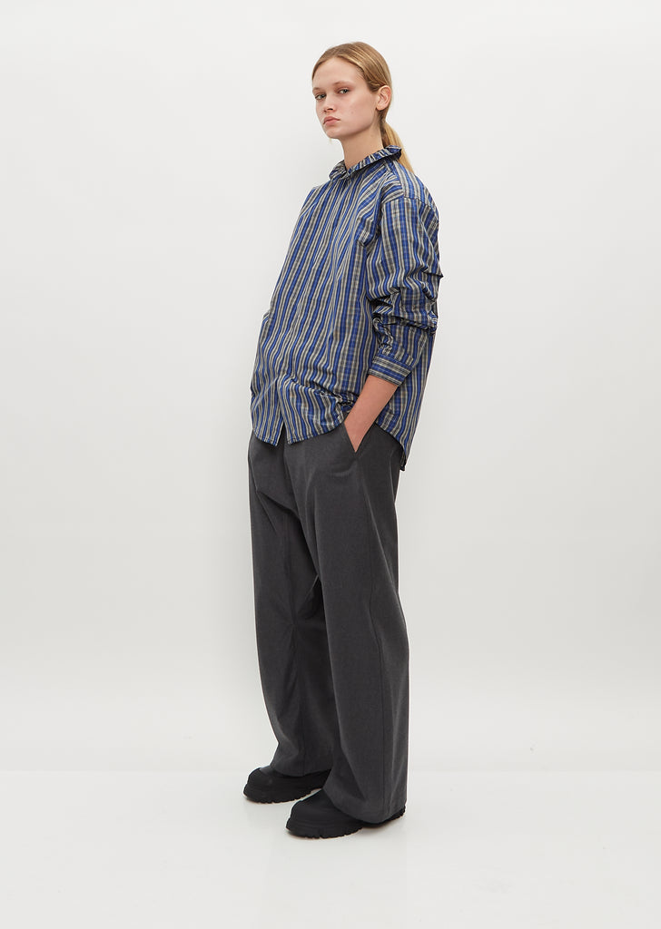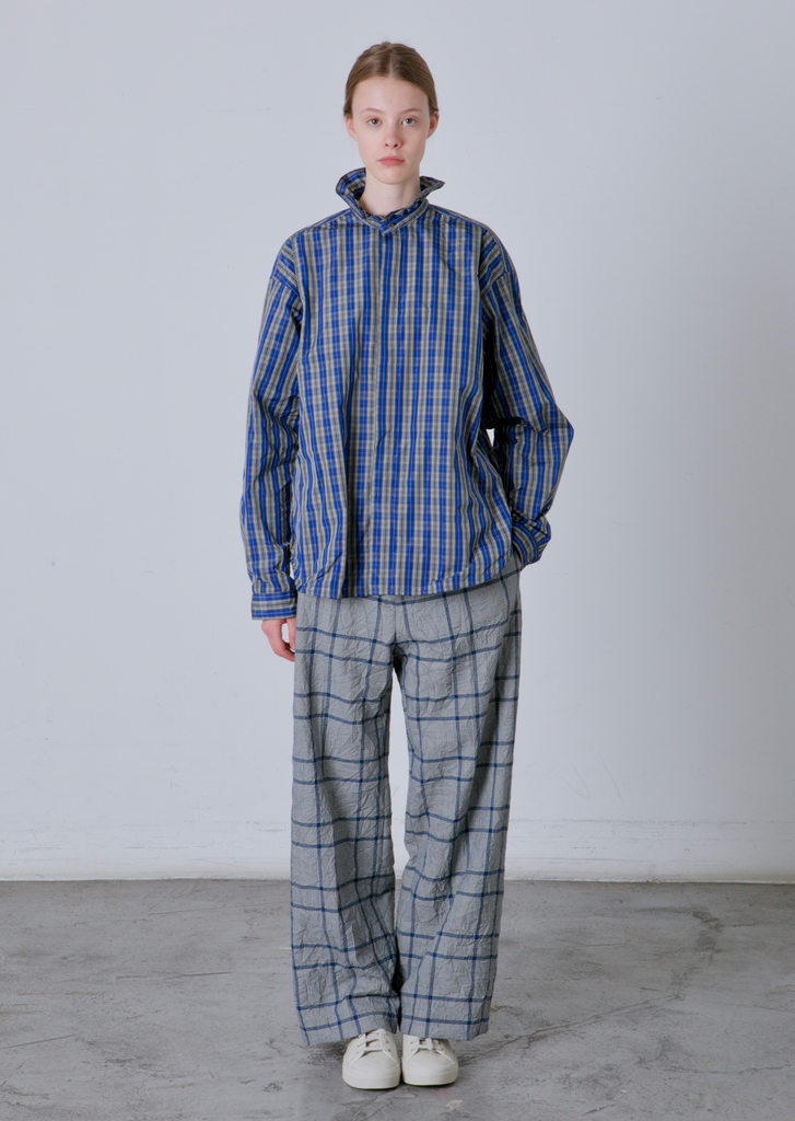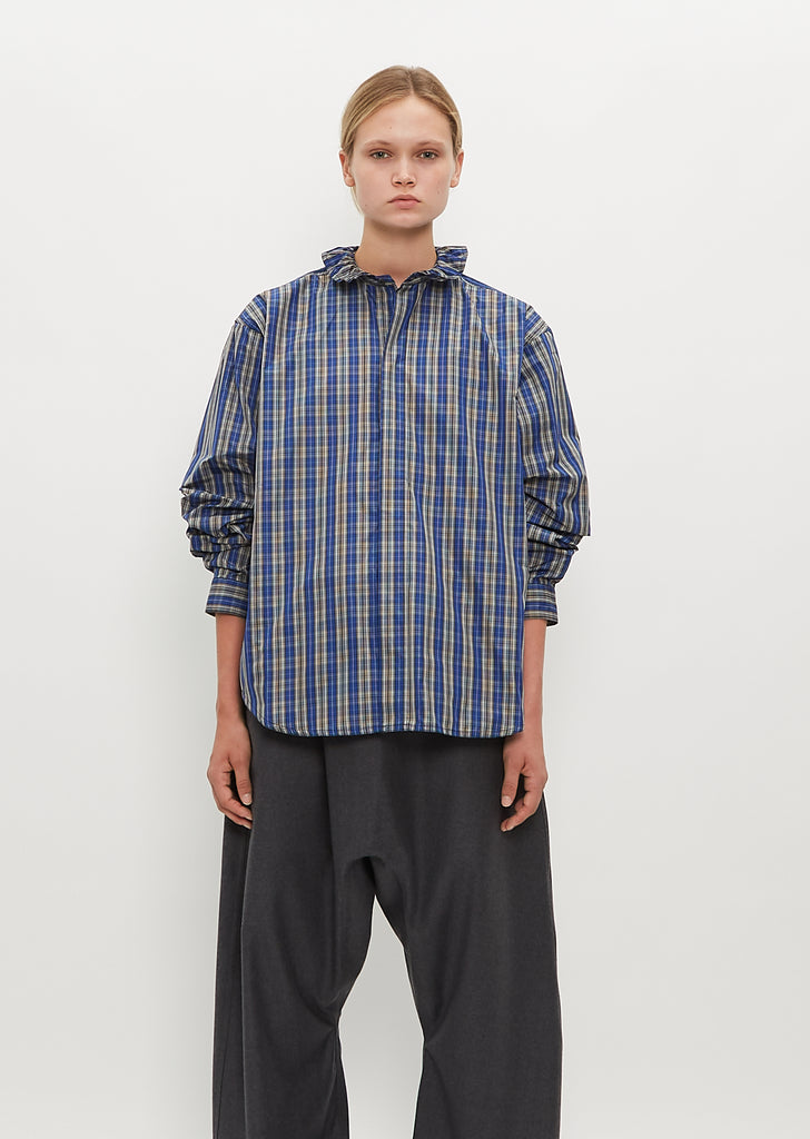 Sofie D'Hoore woven blue shirt in crisp checked taffeta. Features a ruffled collar, buttoned sleeves and buttons closure in front.