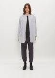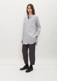 Toujours gray small plaid printed shirt with band collar in extra fine Japanese suvin cotton. Features a single chest patch pocket, curved hem with longer back, side splits, button cuffs, and button front closure. Relaxed, loose fit.