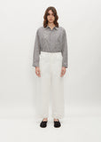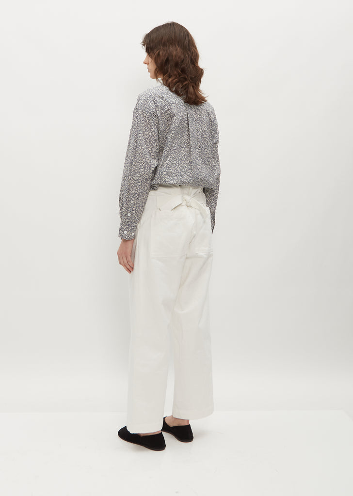 Toujours white pants in 14oz organic cotton denim. Features a back adjustable tie, two back patch pockets, two front slit pockets, belt loops and a zip and botton closure in front. Pants do not come cuffed.