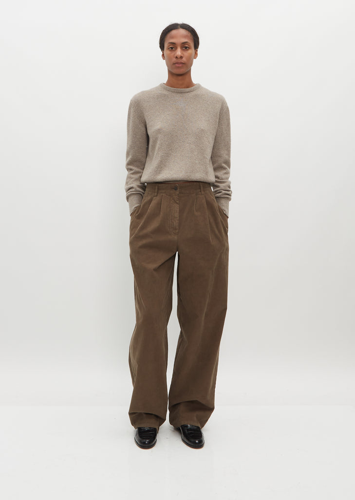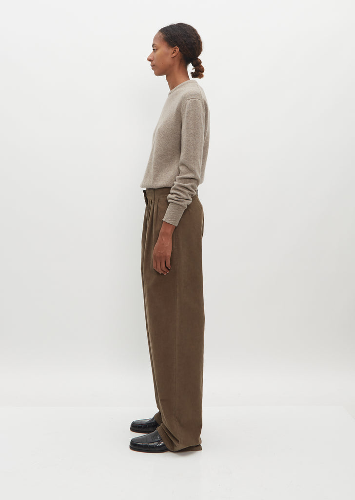The Row camel oversized tailored pant in soft garment-dyed cotton corduroy with relaxed baggy fit created by pressed double front pleats, back welt pockets, and zipper fly closure.