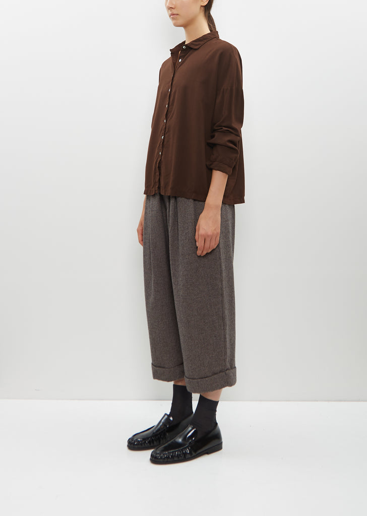 Album di Famiglia signature button-down shirt with a small pointed collar in a coffee brown cotton and viscose blend lightweight twill. Features dropped shoulders and a rounded shirt hem. Finished with Mother-of-pearl buttons.