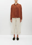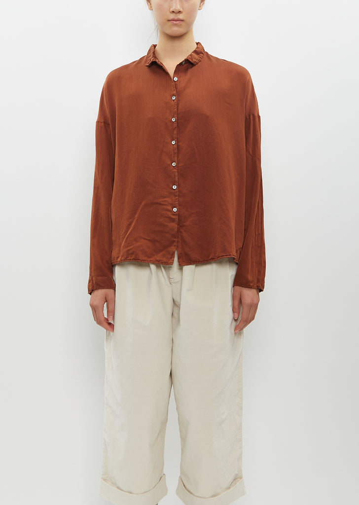 Album di Famiglia button-down shirt with a small pointed collar in a rust silk and cotton blend. Features dropped shoulders and a curved shirttail. Finished with Mother-of-pearl buttons.