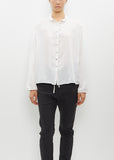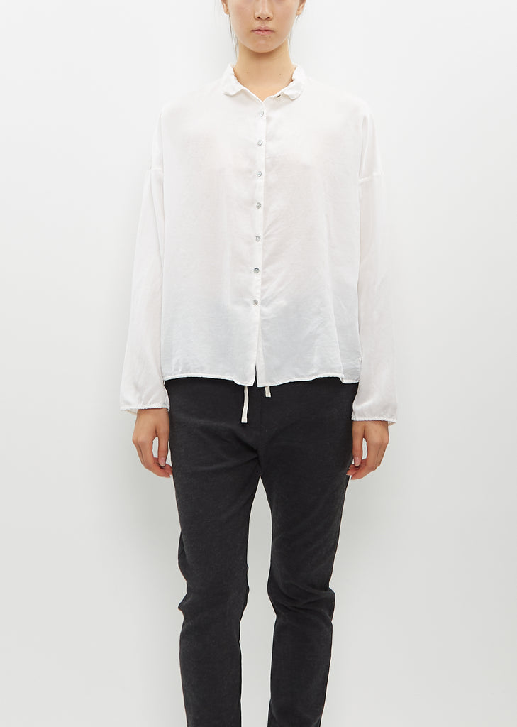 Album di Famiglia button-down shirt with a small pointed collar in a milk white silk and cotton blend. Features dropped shoulders and a curved shirttail. Finished with Mother-of-pearl buttons.