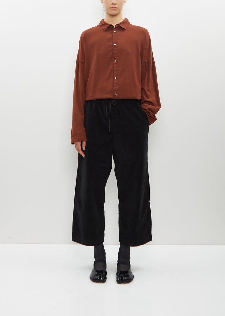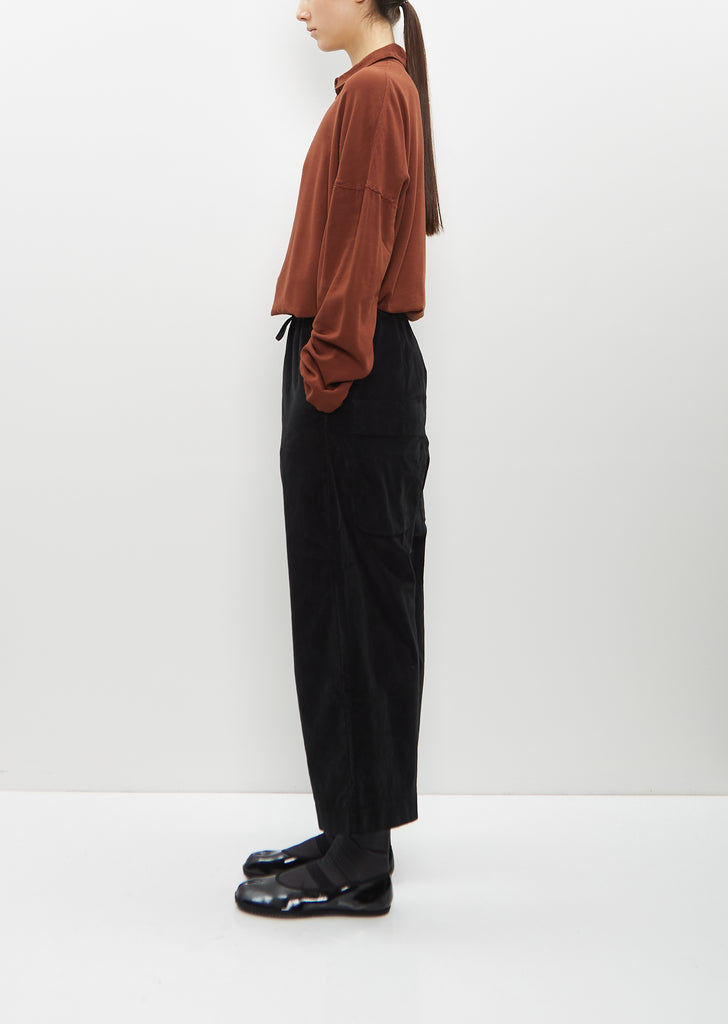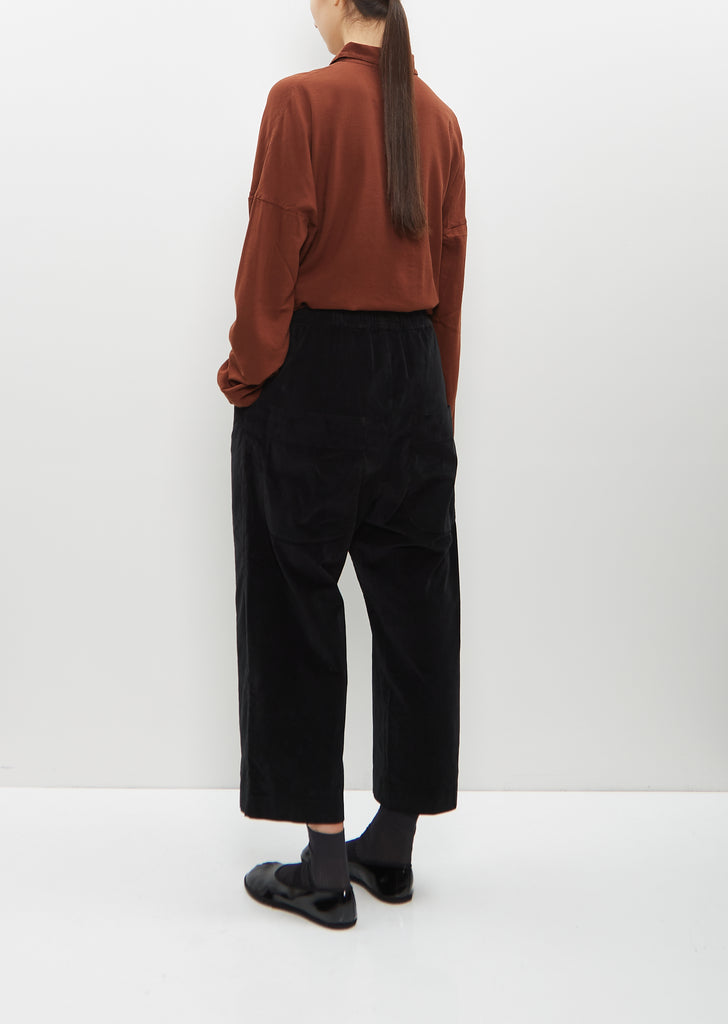 Album di Famiglia signature wide leg trouser with cropped legs in black stretch cotton velvet. Features a wide elasticated waist with a tonal drawcord, slash side pockets and low patch pockets at back. Dropped crotch silhouette with a relaxed fit.