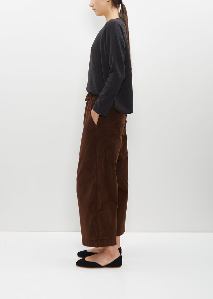 Album di Famiglia signature wide leg trouser with cropped legs in coffee brown stretch cotton velvet. Features a wide elasticated waist with a tonal drawcord, slash side pockets and low patch pockets at back. Dropped crotch silhouette with a relaxed fit.