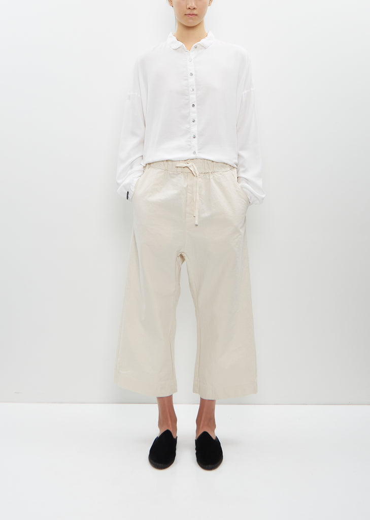 Album di Famiglia signature cropped, wide leg trousers in natural-tone rigid cotton canvas. Features elasticated waist with drawstring, slash side pockets, and patch pockets at back.