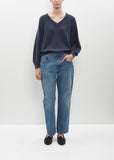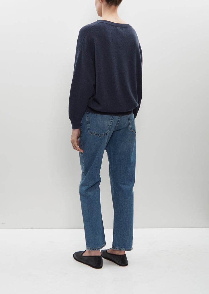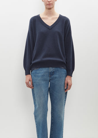 Begg x Co washed navy sweater with a V-neck and dropped shoulders in lightweight tight gauge cashmere knit. Features a ribbed trim at neckline, cuffs and hem. Blouson silhouette with a relaxed t-shirt style fit.