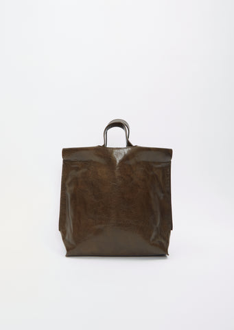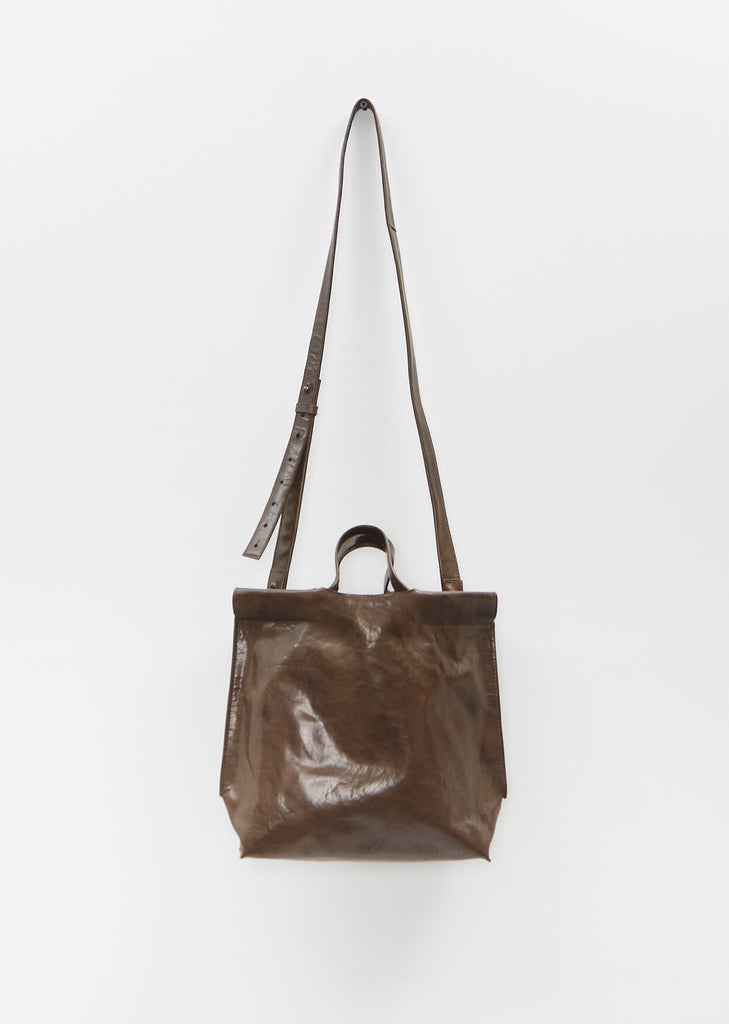 Bea Mombaers olive green shopper bag in the small size with an adjustable and detachable tonal shoulder strap and short top handles in buffalo leather. Features a single interior zipper pocket and an interior slip pocket. Lined in cotton canvas.