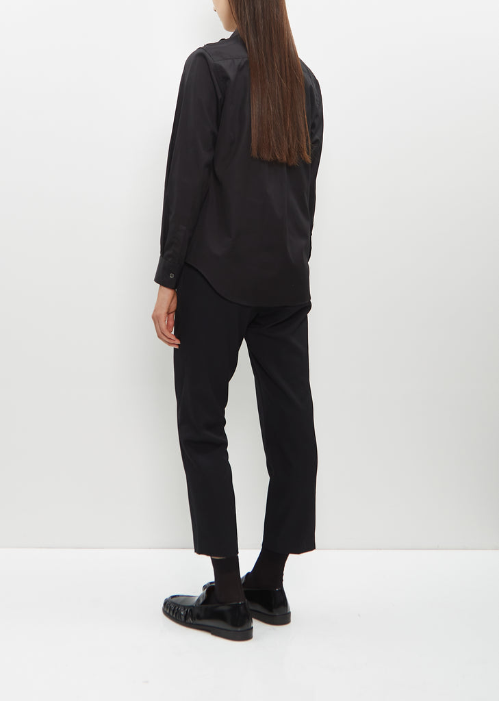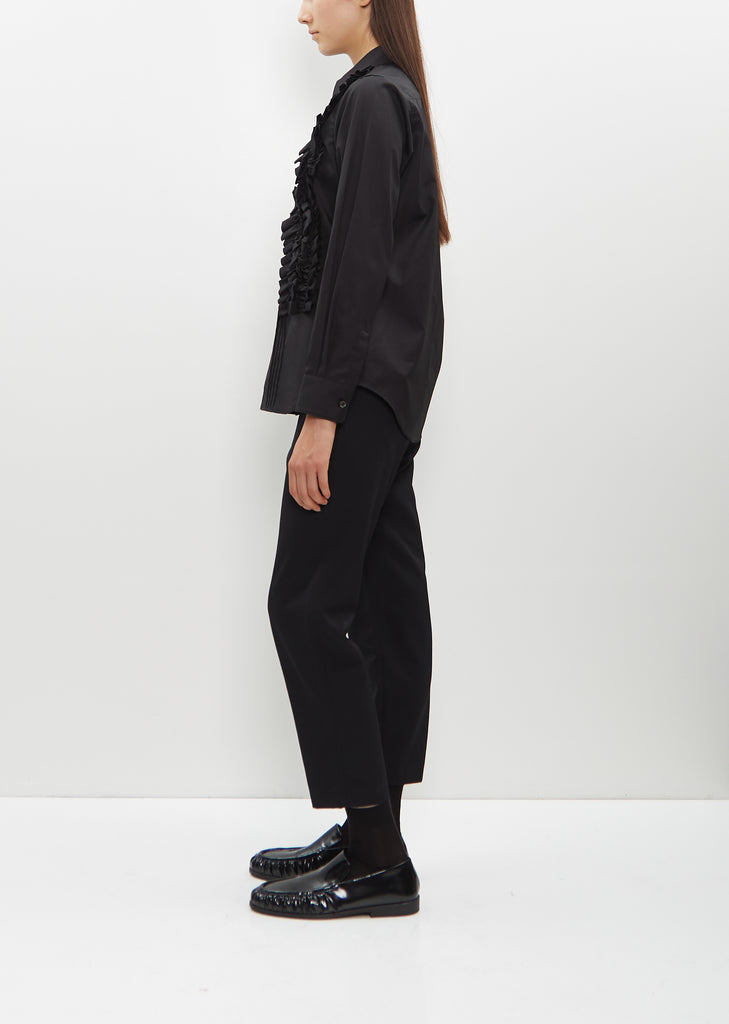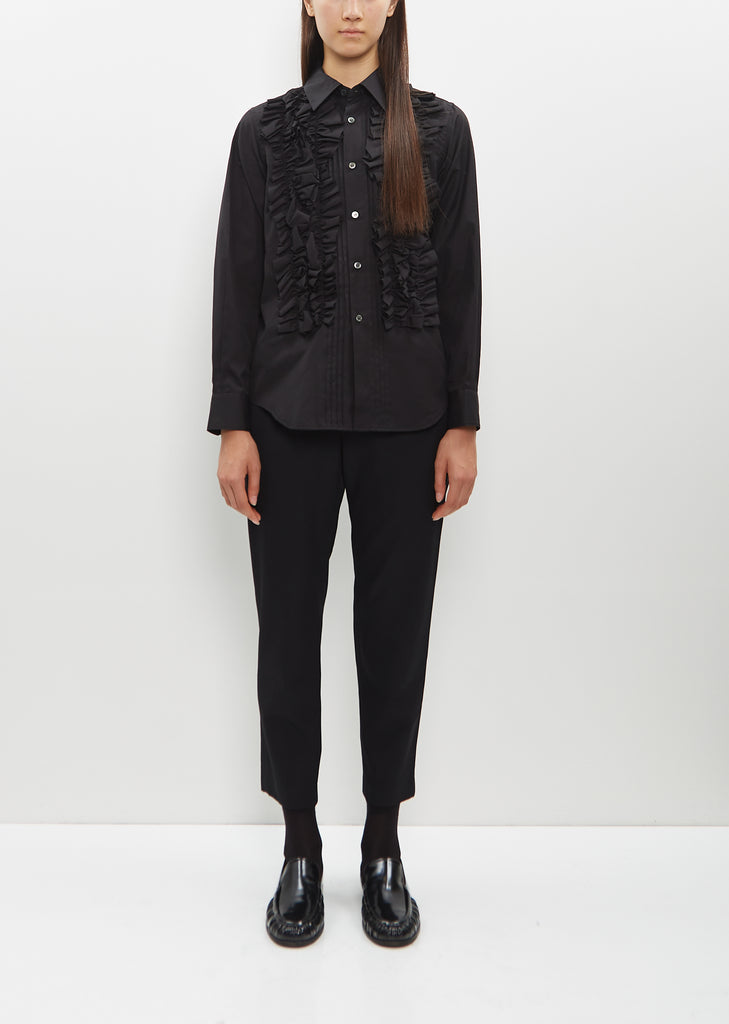 Comme des Garçons Comme des Garçons black long sleeve shirt with ruffles and pleats detail at front in cotton. Features a classic collar, set-in sleeves, buttoned cuffs, a back yoke with box pleat and a contrasting shel-hued buttons closure at front.