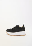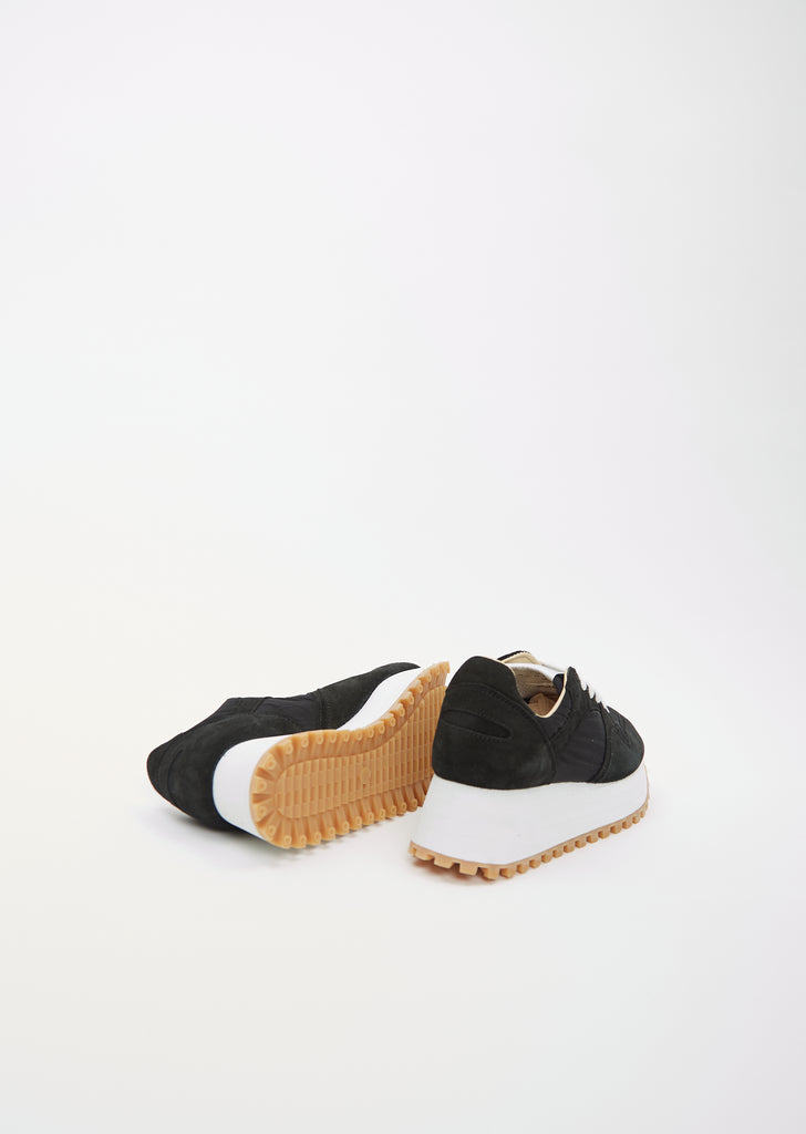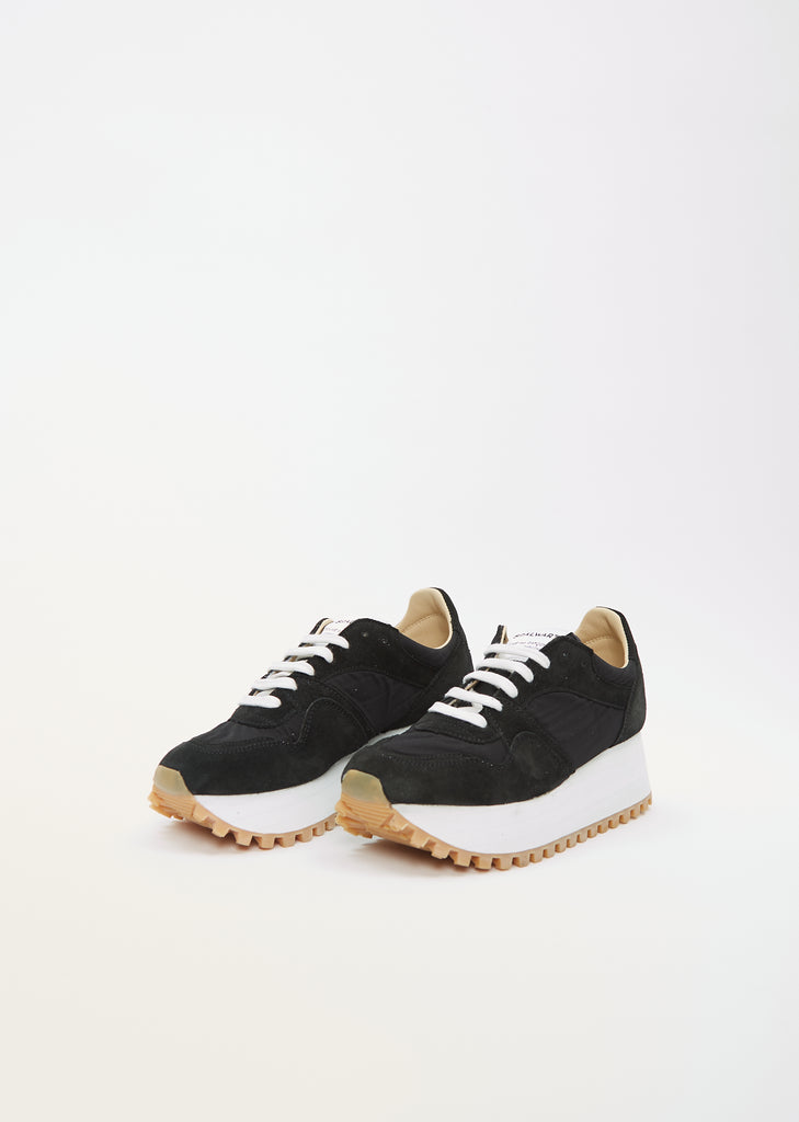 Comme des Garçons Comme des Garçons x Spalwart black marathon platform sneaker with a lace-up front closure in suede leather and cotton. Features a leather insole and a treaded rubber sole.