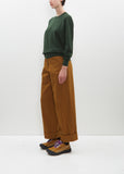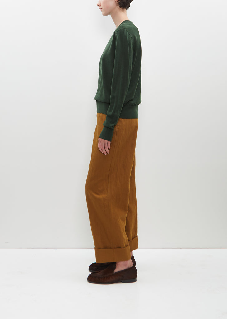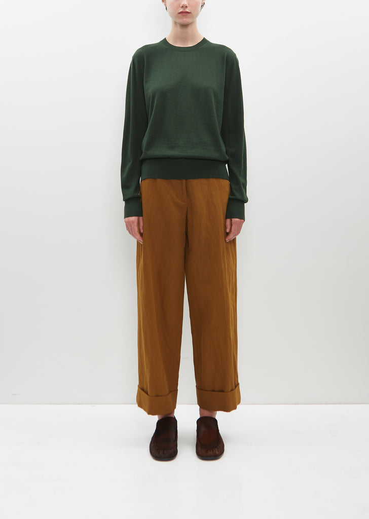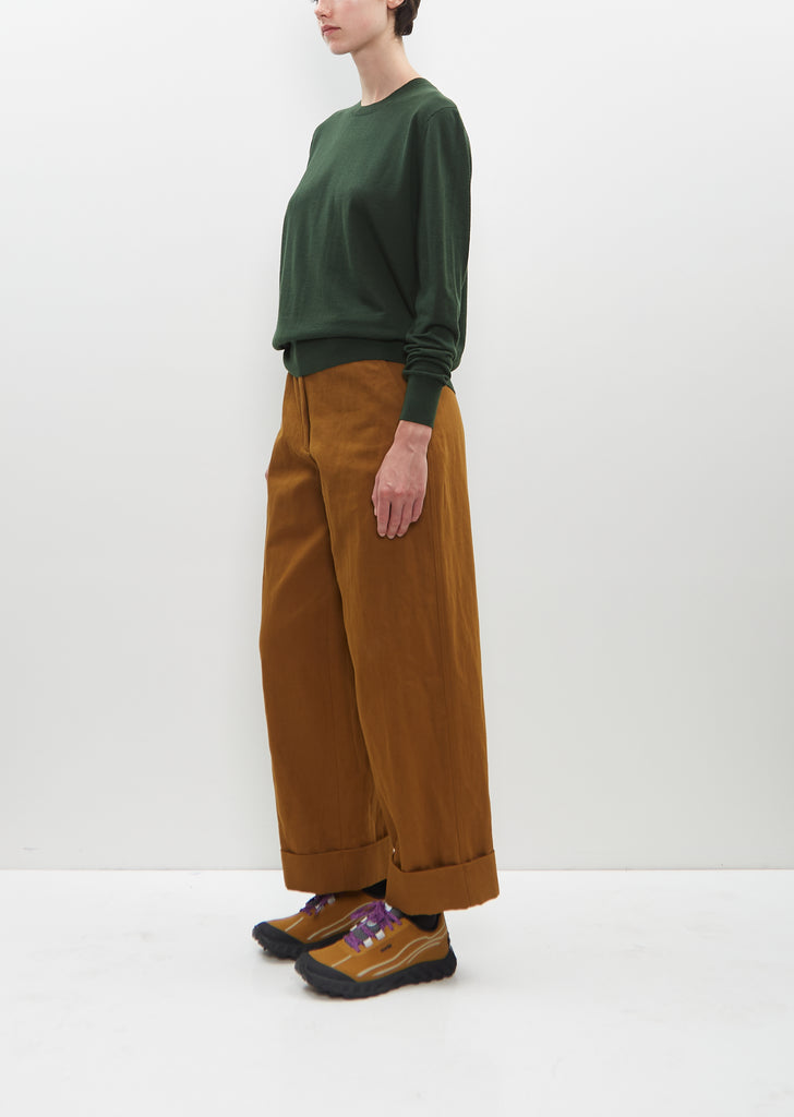 Dries Van Noten signature wide leg trousers with wide cuffs in a washed cotton and linen blend. Features belt loops, angled pockets, welt pockets at back and button and zip-fly fastening.