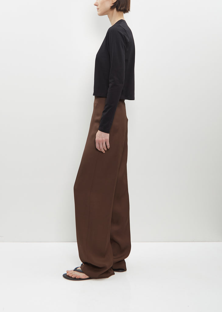 Loulou Studio chocolate brown wide leg pants with seam detail in wool viscose blend. Features hook and zipper fastening on the left side seam.