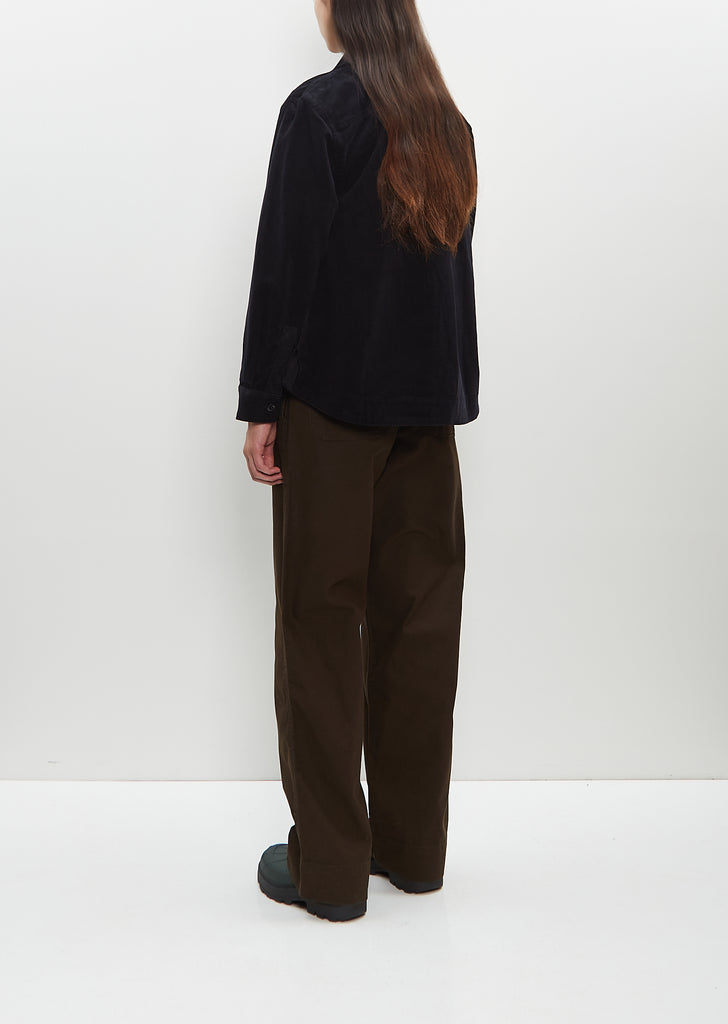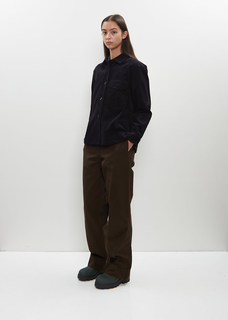 MHL by Margaret Howell black overshirt with a single flap pocket at chest in plain-weave cotton corduroy. Features a stitch-through raised placket, chest flap patch pocket, side split hem and box pleat at back yoke. Finished with tonal corozo buttons. Relaxed fit. Comes unlined.