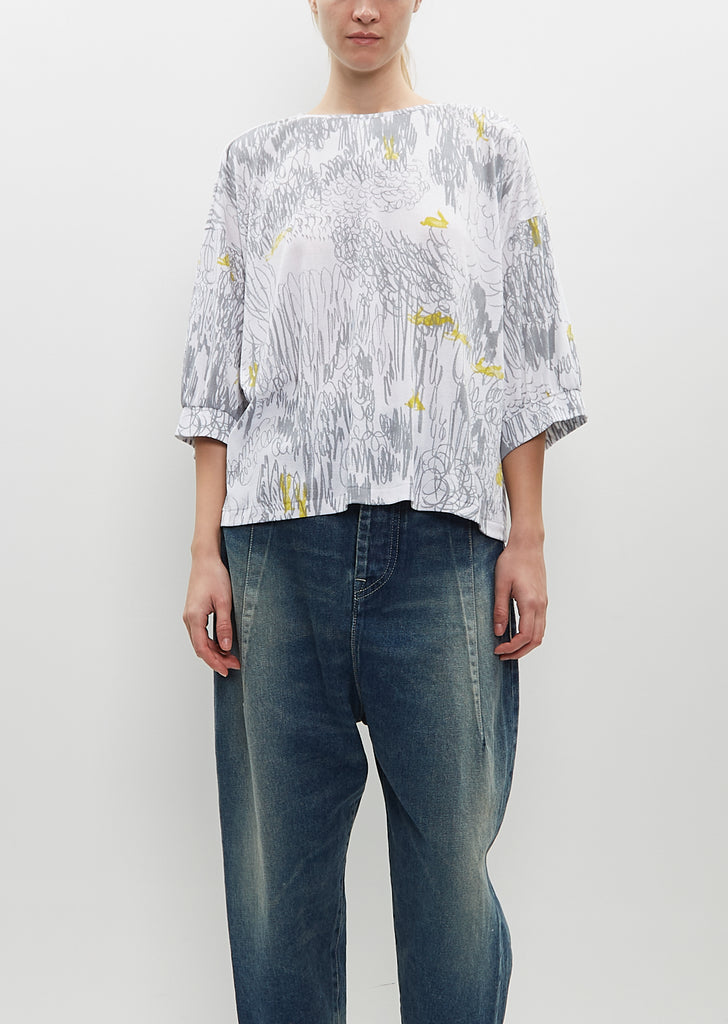 Minä Perhonen light gray t-shirt with three quarter gathered sleeves in cotton with a freehand drawn pattern. Features a round neckline and dropped shoulders.