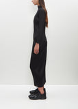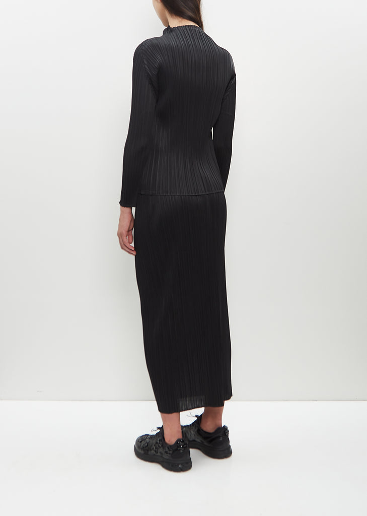 Pleats Please by Issey Miyake black long sleeves top with a high mock neck in signature fine pleated chiffon. Features slightly dropped shoulders. Closer fit.
