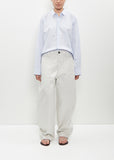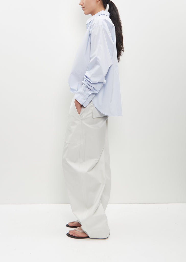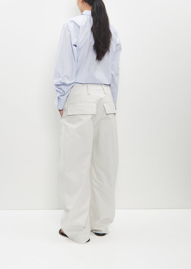 Sofie D'Hoore light grey relaxed slightly curved pants with wide legs and patch angled pockets in cotton twill. Features flap pockets at back, belt loops, and a button and zip-fly fastening.