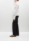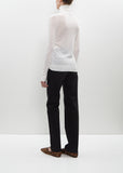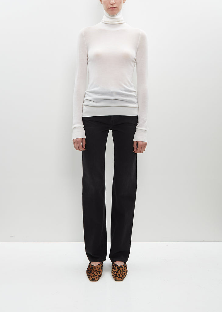 Totême off white semi-sheer sweater with a ribbed turtle neck in fine wool and silk blend knit. Features slightly dropped shoulders, a fitted hem, embroidered logo at left sleeve, and ribbed trim at cuffs, and hem. Closer fit.