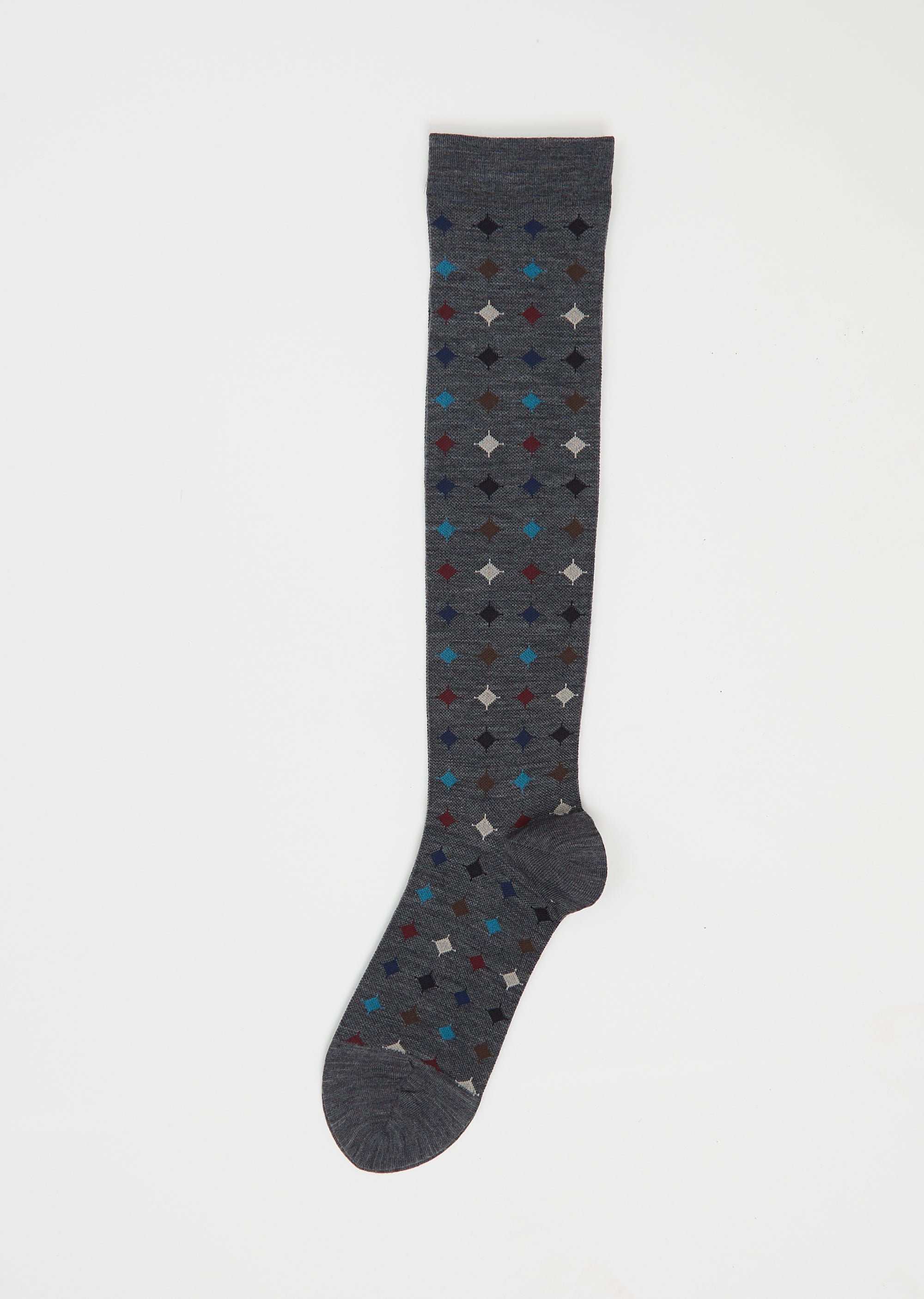 Antipast mix grey high compression socks with a multicolored geometric design in a wool nylon blend knit. Features reinforced top opening and contoured heel and toe.