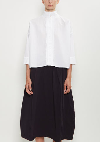 Bergfabel white slightly cropped shirt with a small classic collar and pleated placket detail in crisp cotton. Features 3/4 sleeves, dropped shoulders, buttoned cuffs and back yoke detail. Finished with tonal buttons. Boxy, relaxed fit.