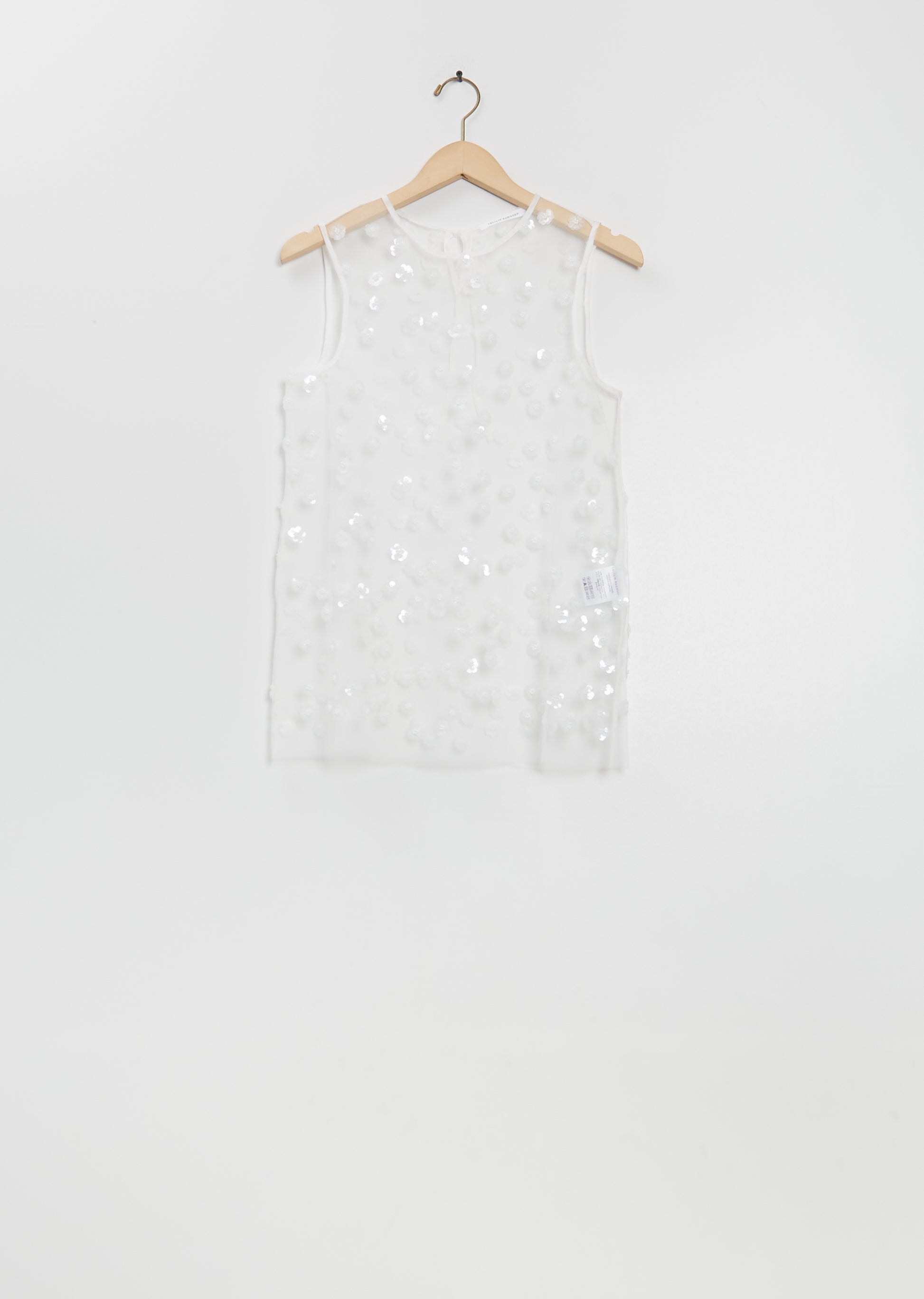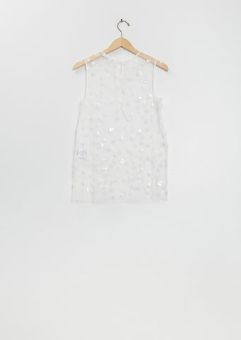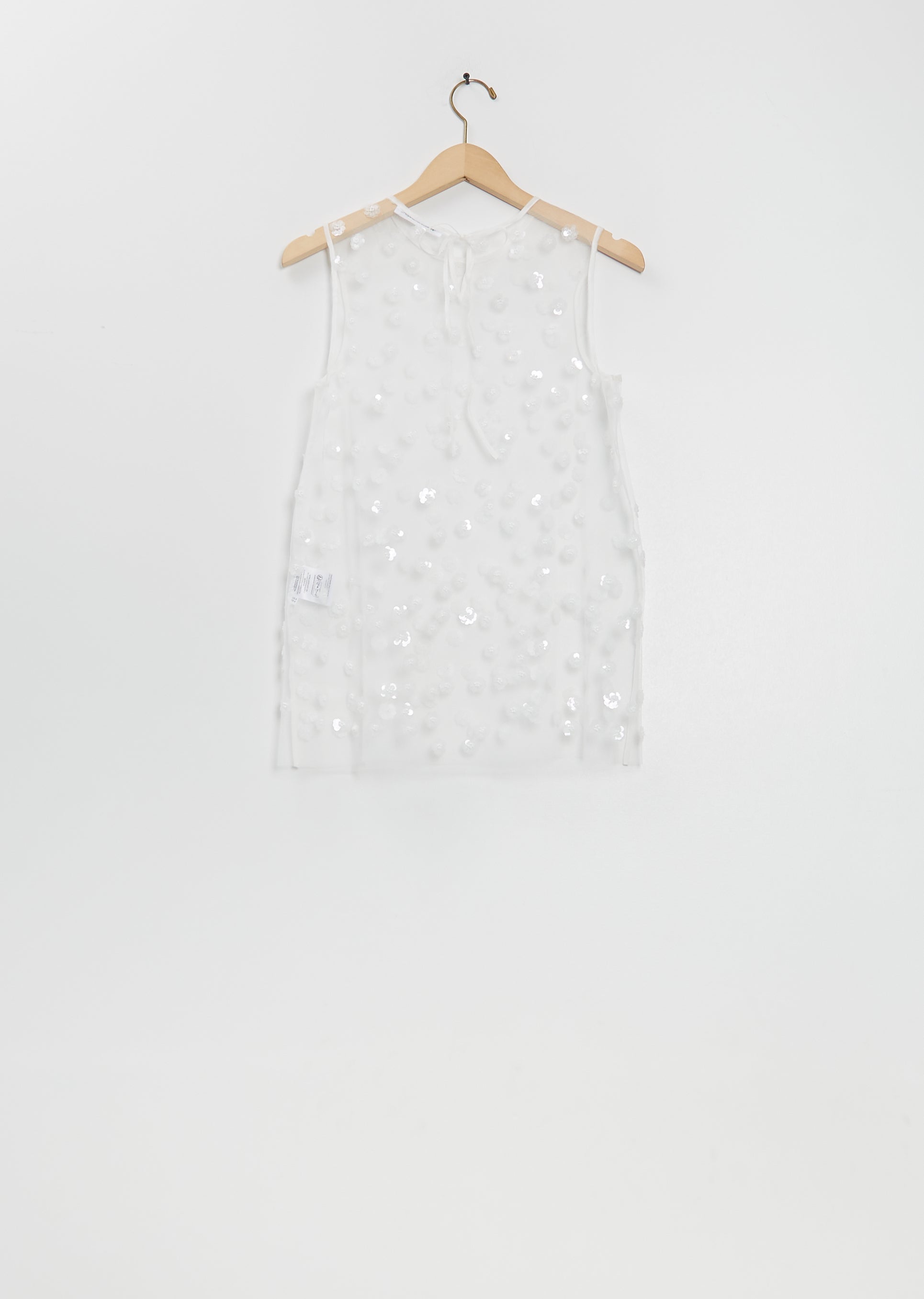 Cecilie Bahnsen white sleeveless top with a round neckline in an embroidered sequin blossom tulle. Features a tie fastening at back neck.