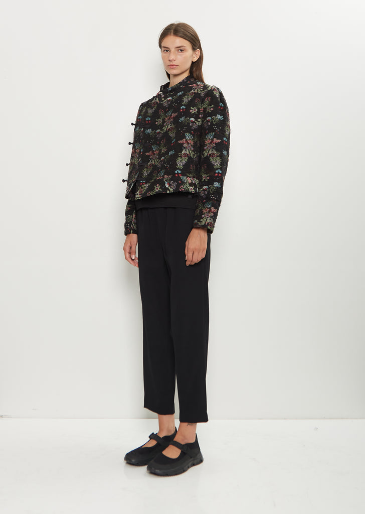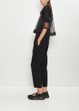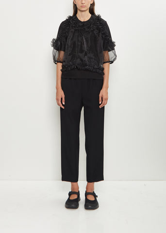Comme des Garçons Comme des Garçons black pull-on pant with cropped, straight legs and an elasticated waist in tropical wool twill. Features an interior adjustable drawstring and side seam pockets.