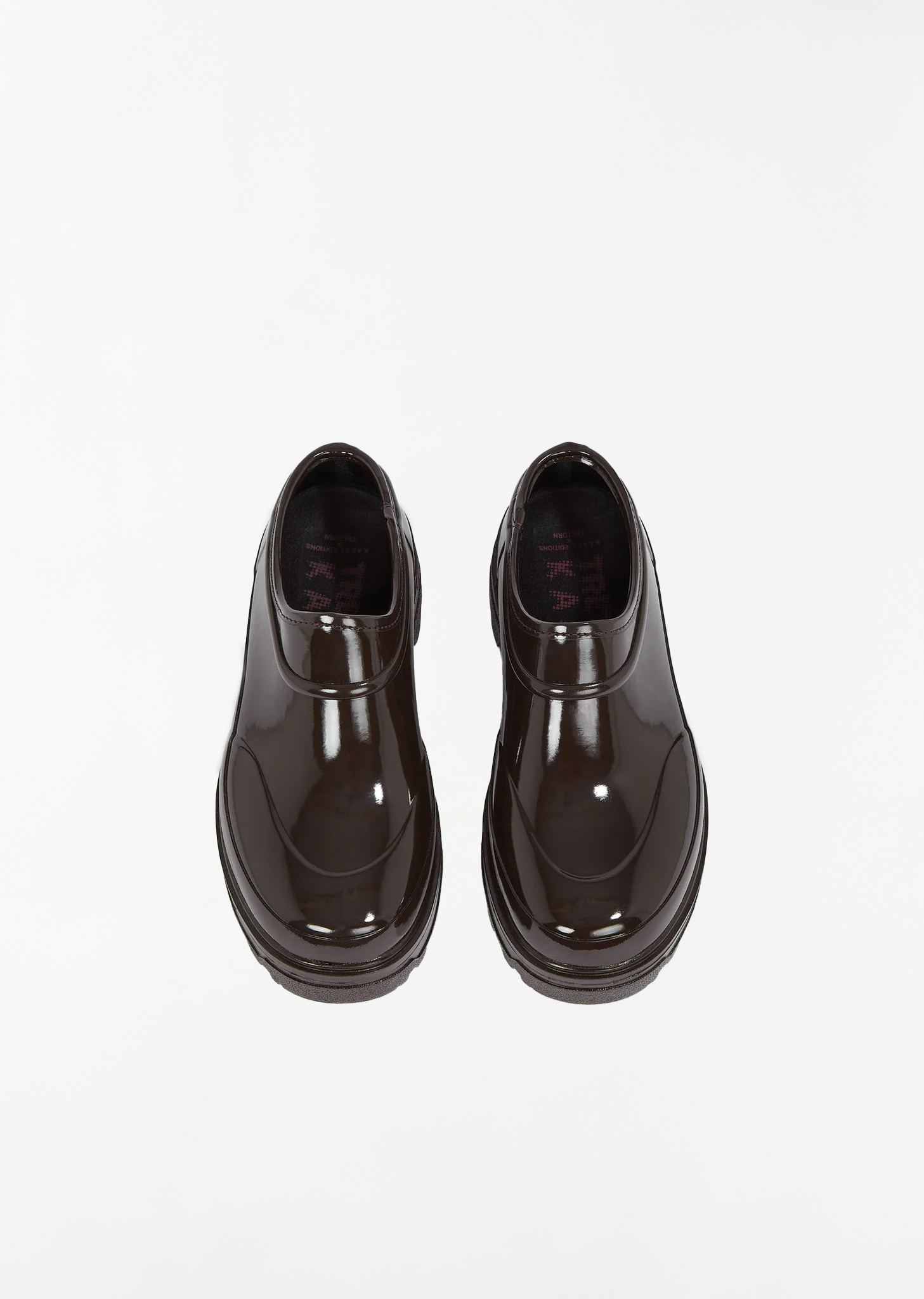 Kassl in collaboration with Tretorn coffee brown slip-on loafer with a chunky rubber sole in Tretorn's signature water-resistant natural rubber with a shiny finish. Features a round toe and a removable molded BLOOM® insole for comfort. Lined in black waterproof, quick drying recycled polyester.