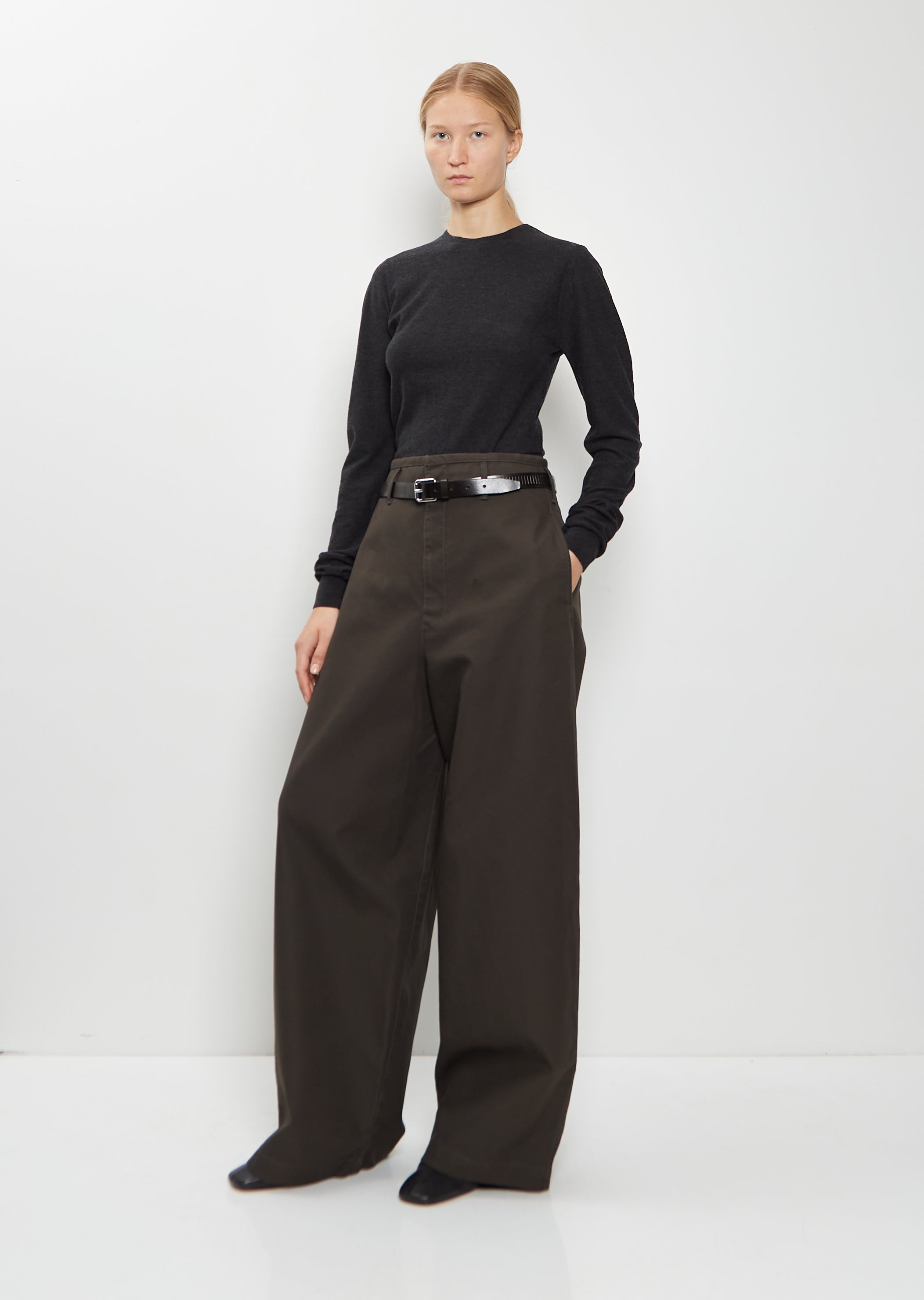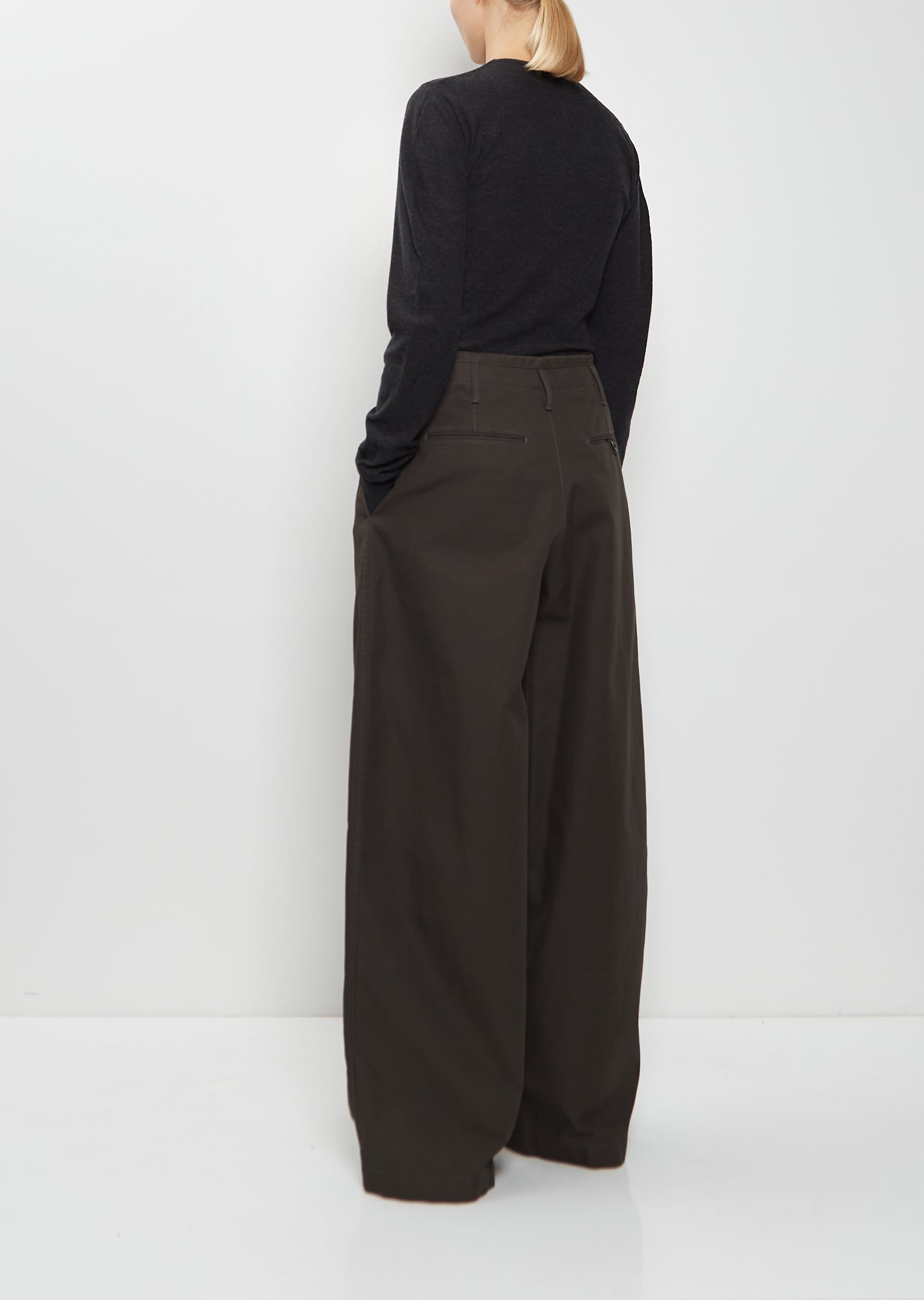 Lemaire espresso brown oversized pants with wide, straight legs in heavyweight cotton twill. Features belt loops, side seam pockets, welt pockets at back, and a concealed hook and eye zip fastening.