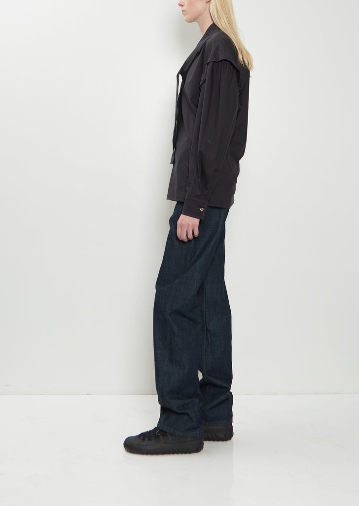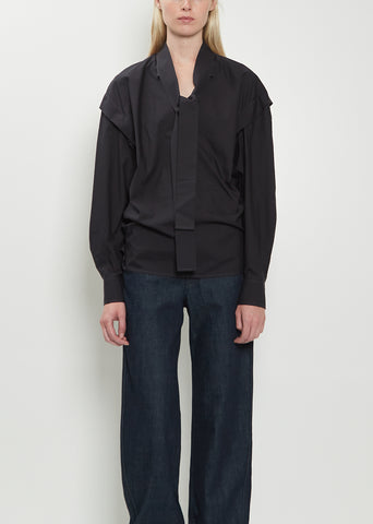 Lemaire black blouse with a V-neckline and attached ascot tie at neck in washed cotton and silk blend. Features dropped shoulders with pleat detail, buttoned cuffs and side slits. Closer fit at waist.