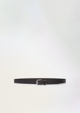 Lemaire dark brown belt with silver-toned metal buckle in vegetable tanned soft leather with embossed rail motif. Features a leather loop, adjustable length and engraved logo.