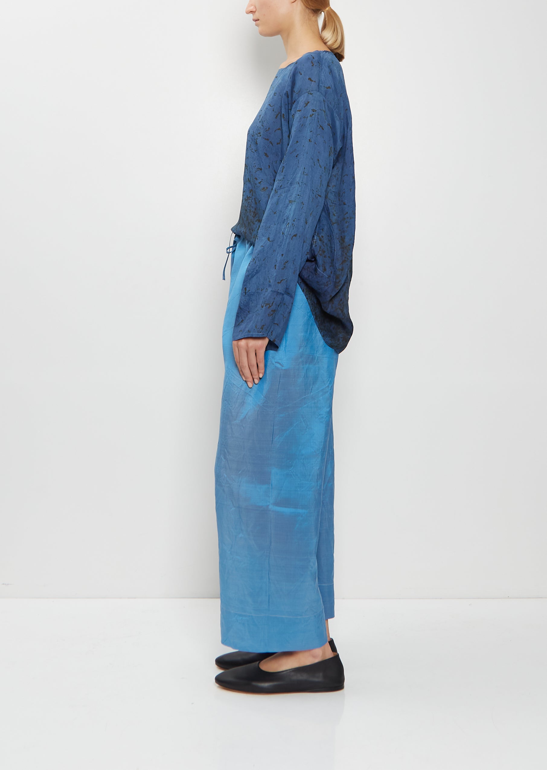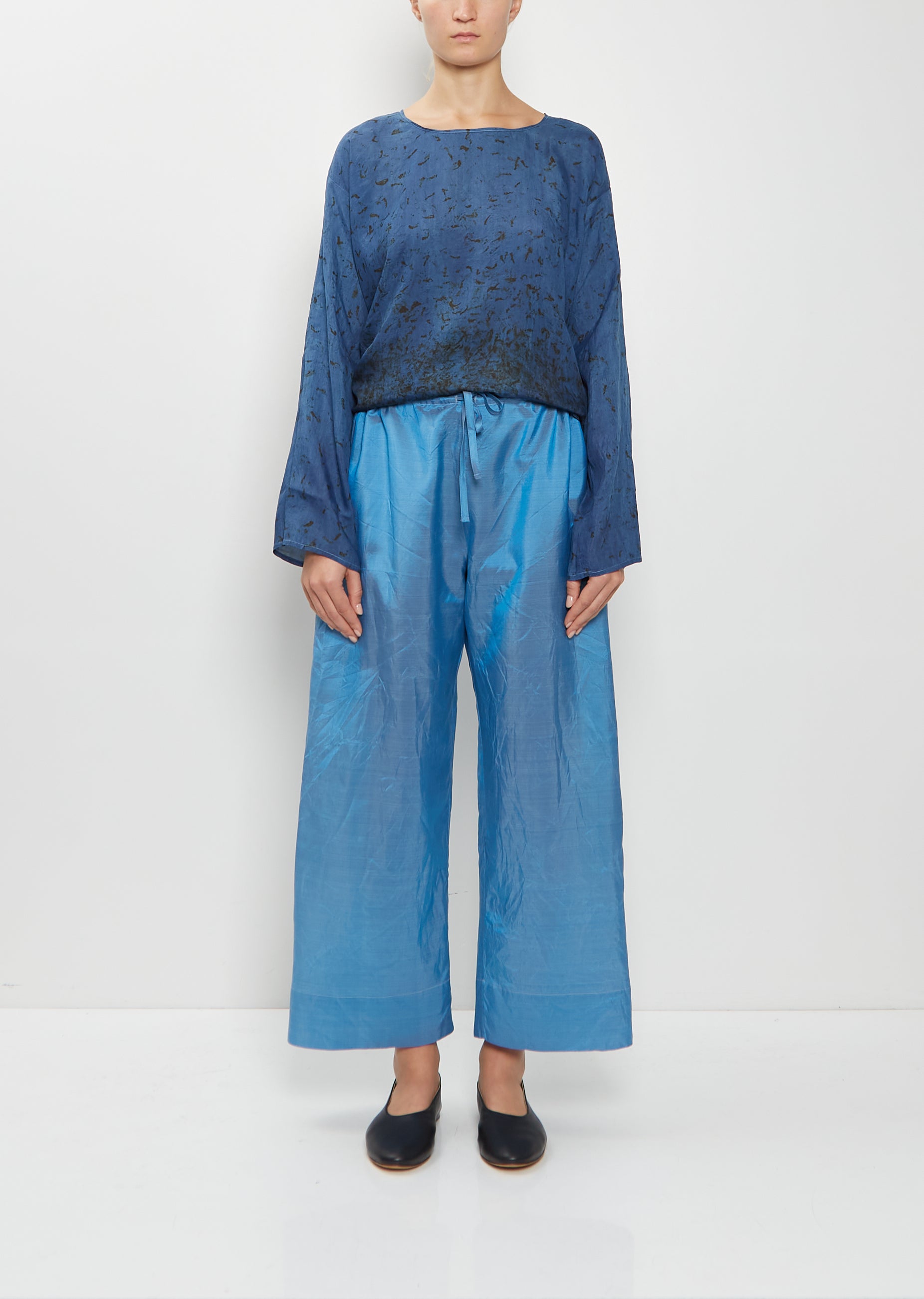 dosa blue pull-on pants with cropped, wide legs and a gathered drawstring waist in a soft and luxurious silk satin. Relaxed fit.