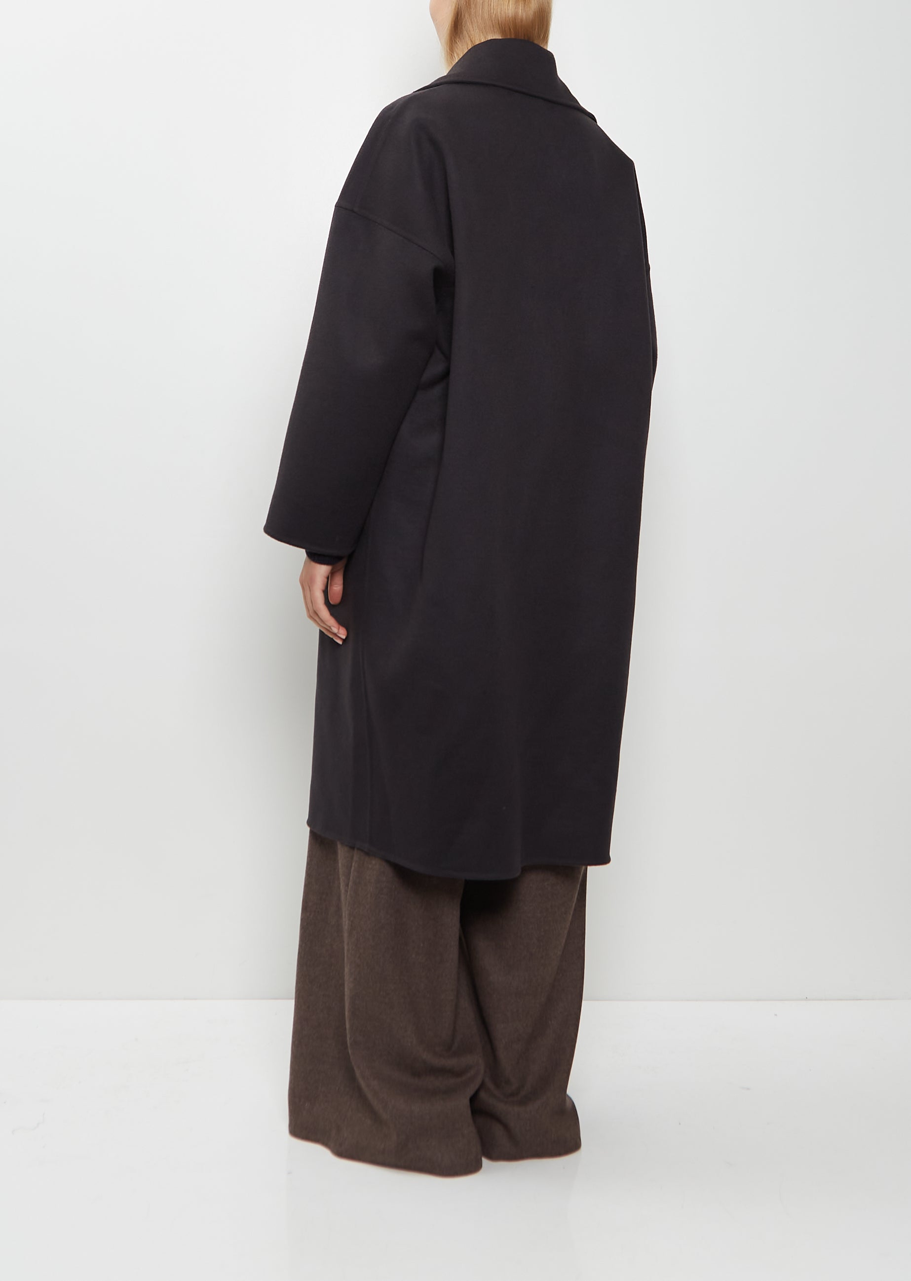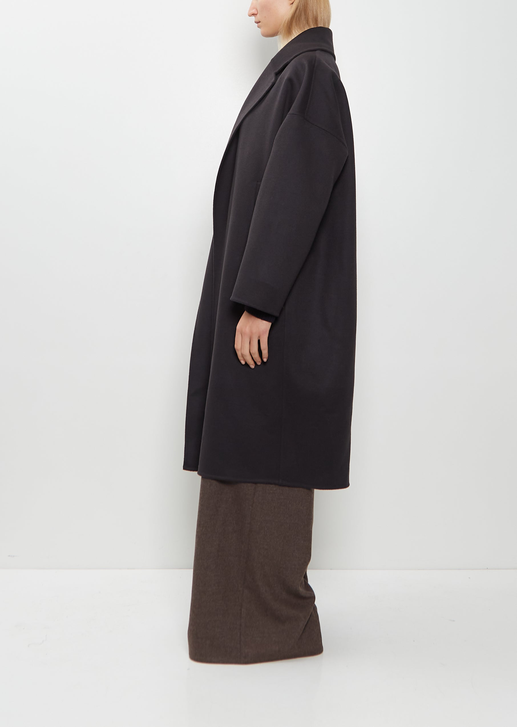 Duśan black coat with a notched collar and open front in ultra-soft felted cashmere. Features dropped shoulders and side welt pockets. Comes unlined. Oversized, relaxed fit.