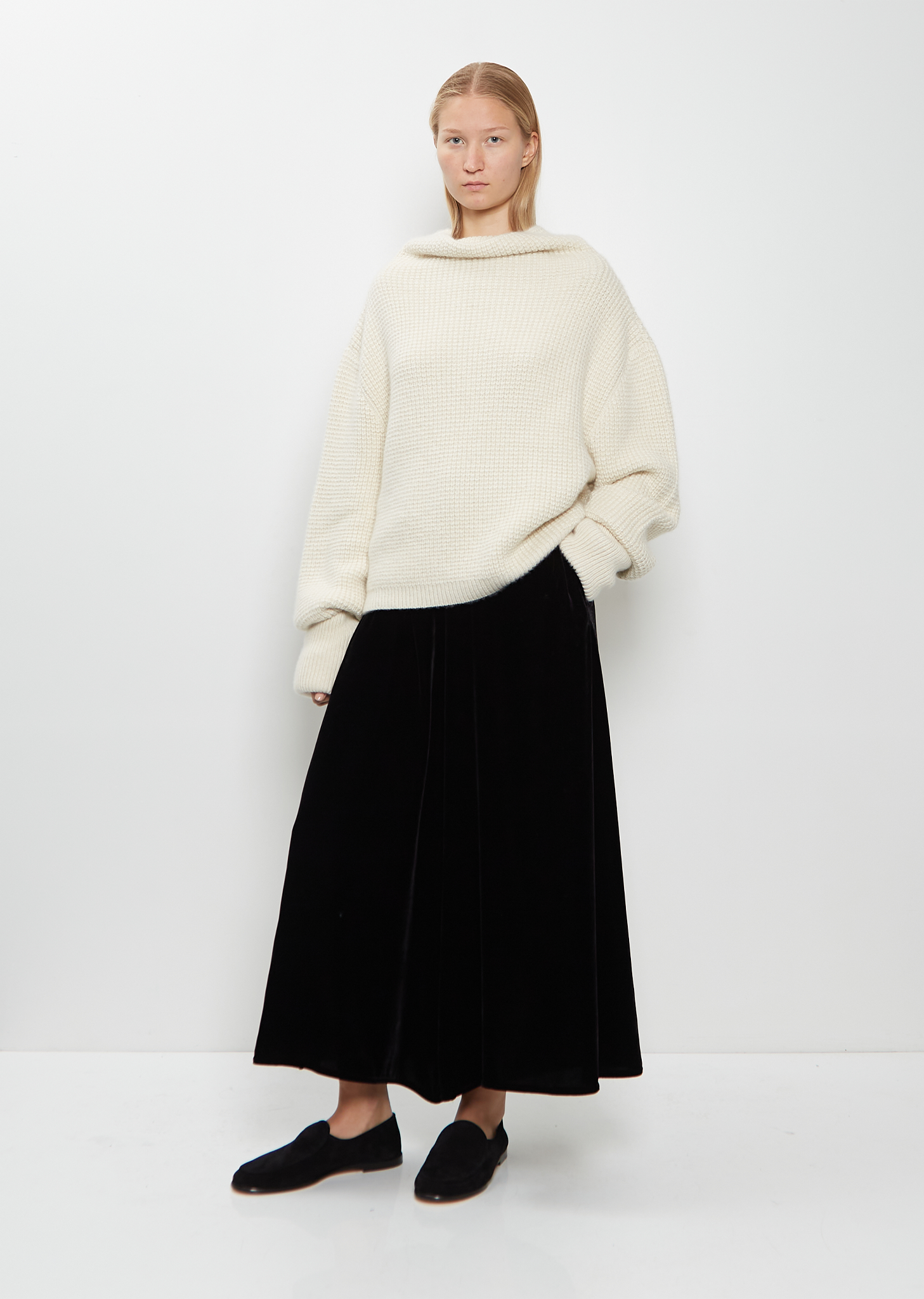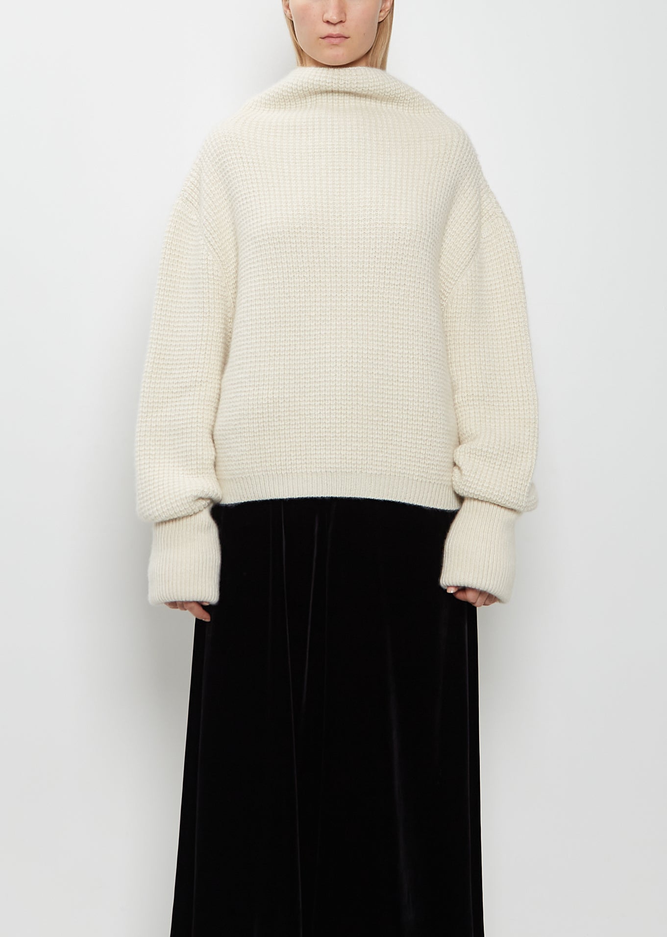 Duśan bone white sweater with a mock neckline and elongated sleeves in an ultra-soft cashmere knit. Features dropped shoulders, cuffed sleeves, and ribbed trim finishings at cuffs and hem. Relaxed, oversized fit.