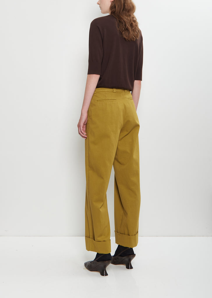 Dries Van Noten light khaki signature versatile wide and straight leg trousers with wide cuffs in over-dyed cotton twill. Features belt loops, angled pockets, welt pockets at back and button and zip-fly fastening.