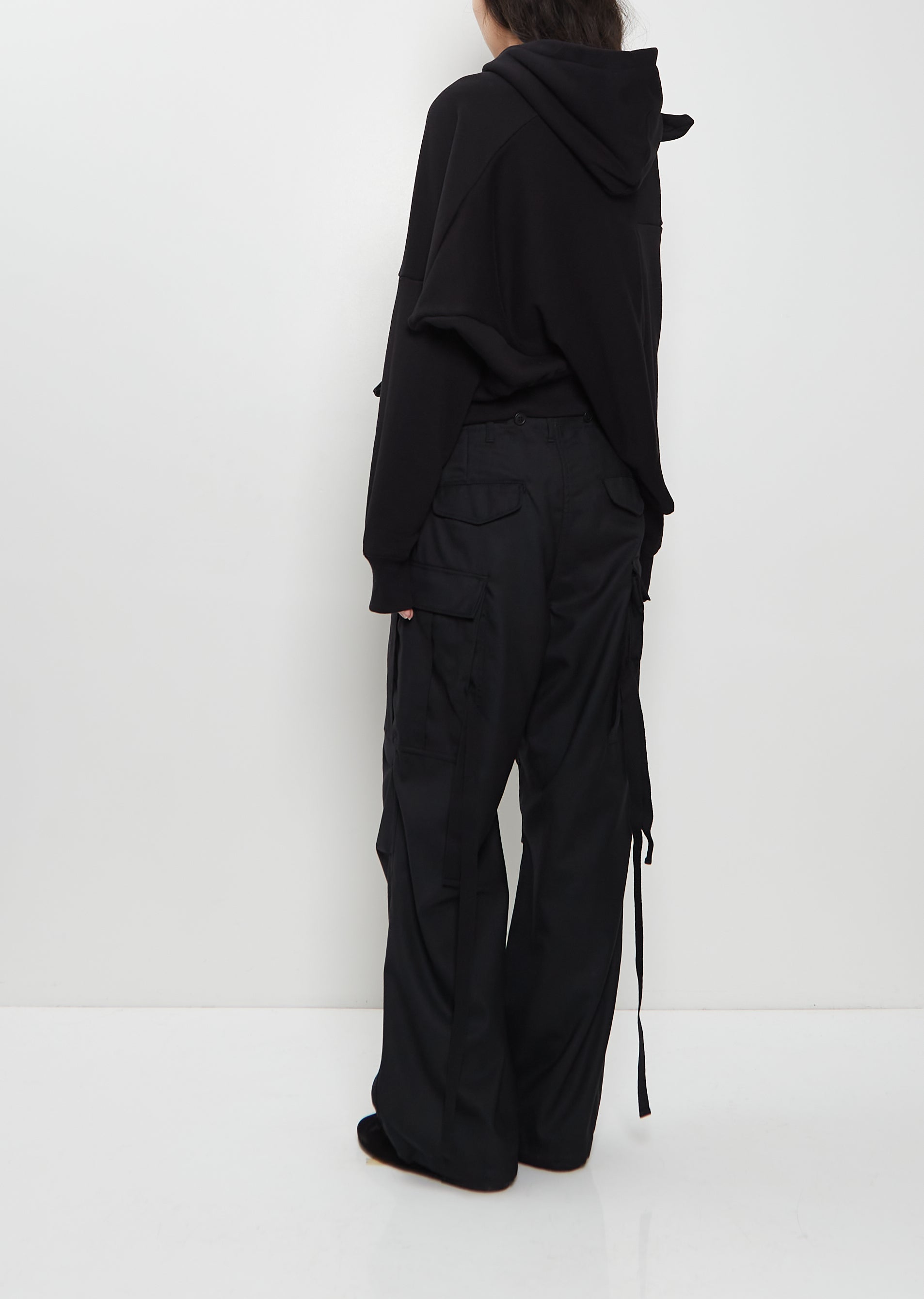 Junya Watanabe black cargo pants with wide, straight legs and button and zip-fly fastening in a wool blend twill. Features belt loops, button details along waist, waist adjusters at sides, angled press button flap pockets, press button flap pockets at legs, adjustable drawstring cuffs, press button flap pockets at back, and attached cotton ribbon details at back pockets.