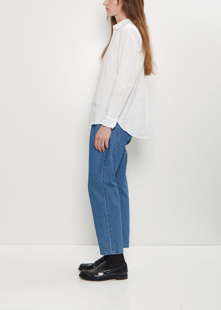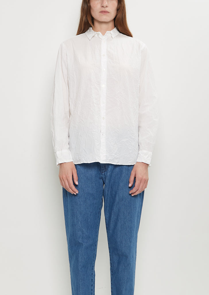Pas de Calais white shirt with a mini collar and tonal button front in cotton with a crinkle effect. Features set-in sleeves, buttoned cuffs, curved hem, and a box pleat at back yoke.